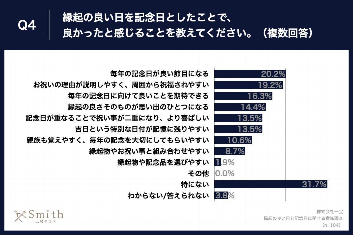 「Q4.縁起の良い日を記念日としたことで、良かったと感じることを教えてください。(複数回答)」(n=104)と質問したところ、「毎年の記念日が良い節目になる」が20.2%、「お祝いの理由が説明しやすく、周囲から祝福されやすい」が19.2%、「毎年の記念日に向けて良いことを期待できる」が16.3%という回答となりました。