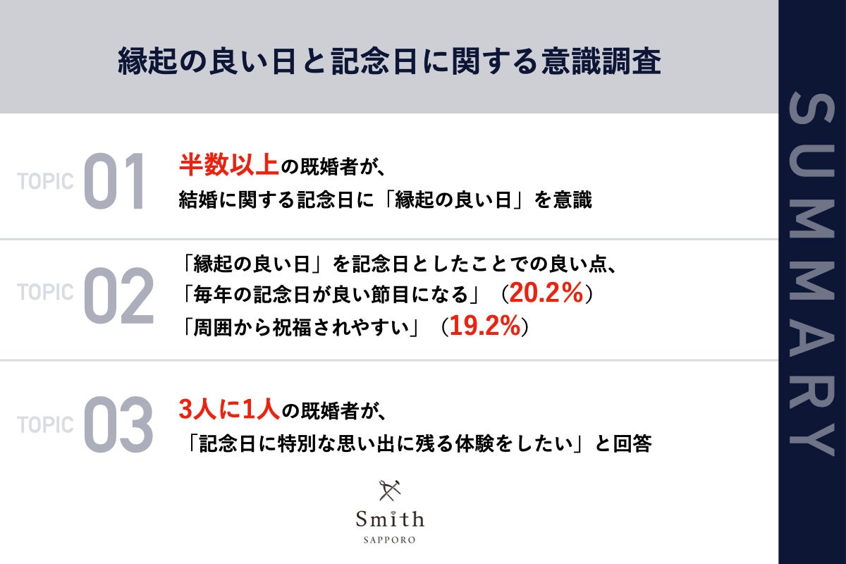 株式会社 一宝(本社:北海道札幌市)が運営する、手作り結婚指輪・婚約指輪・ペアリング専門店「工房Smith札幌」は、5年以内に結婚した北海道在住の方104名を対象に、縁起の良い日と記念日に関する意識調査を実施しましたので、お知らせいたします。