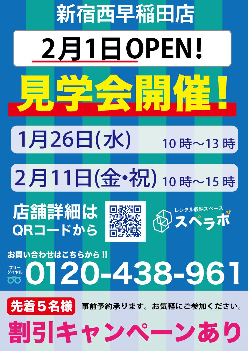 東京都心を中心に展開中のトランクルーム「スペラボ」が新宿区にOPEN!!利用者様オープン前先行見学会を1/26(水)、オープン後の見学会を2/11(金・祝)に行わせていただきます!!