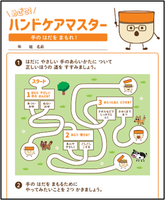 日ごろ観察することの少ない自分の手を観察し、ハンドケアに対して関心を高めていきます。いつも行っている手洗い方法についても、迷路を活用するなど、楽しく学べる内容になっています。