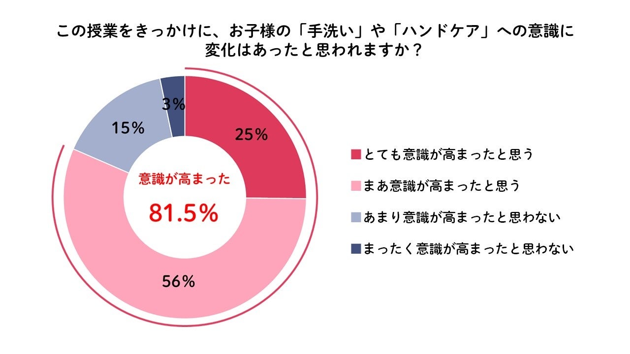 2022年に授業を実施いただいた先生からは、「手洗い・消毒は学校で指導しているが、その後のハンドケアを伝えることはあまりなかったので、手荒れやハンドケアについて考えるよいきっかけになった」といった声をいただきました。また、授業を受けた児童のご家庭への調査を行ったところ、「授業をきっかけに「手洗い」や「ハンドケア」への意識が高まった」と回答した方が81.5%となりました。