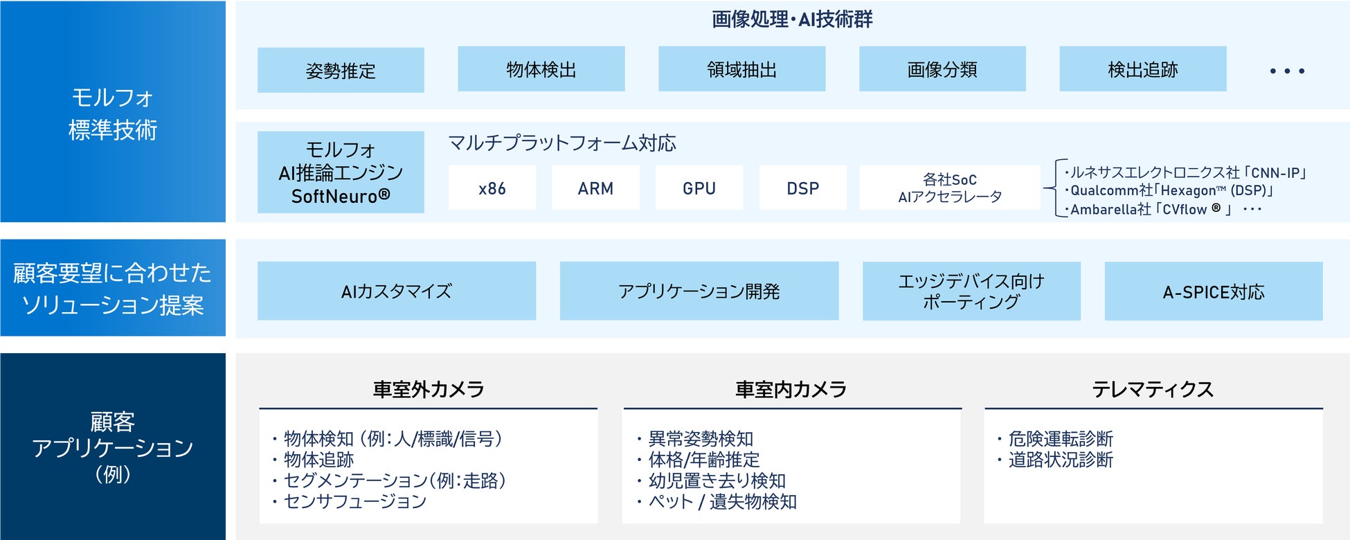 車載向けアプリケーションは、車室外カメラ(AD/ADAS)、車室内カメラ(DMS/OMS)、テレマティクス(クラウド連携サービス)に大別されます。モルフォの標準技術を活用し、各分野向けの画像処理・AIアプリケーションを開発可能です。