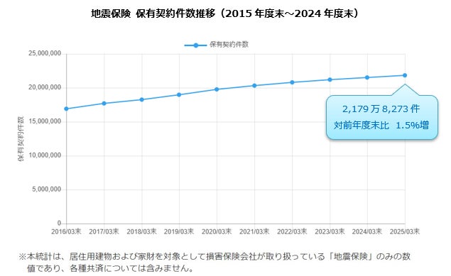 地震保険 保有契約件数 最高値を更新2,179万8,273件(2024年度末現在、対前年度末比1.5%増)