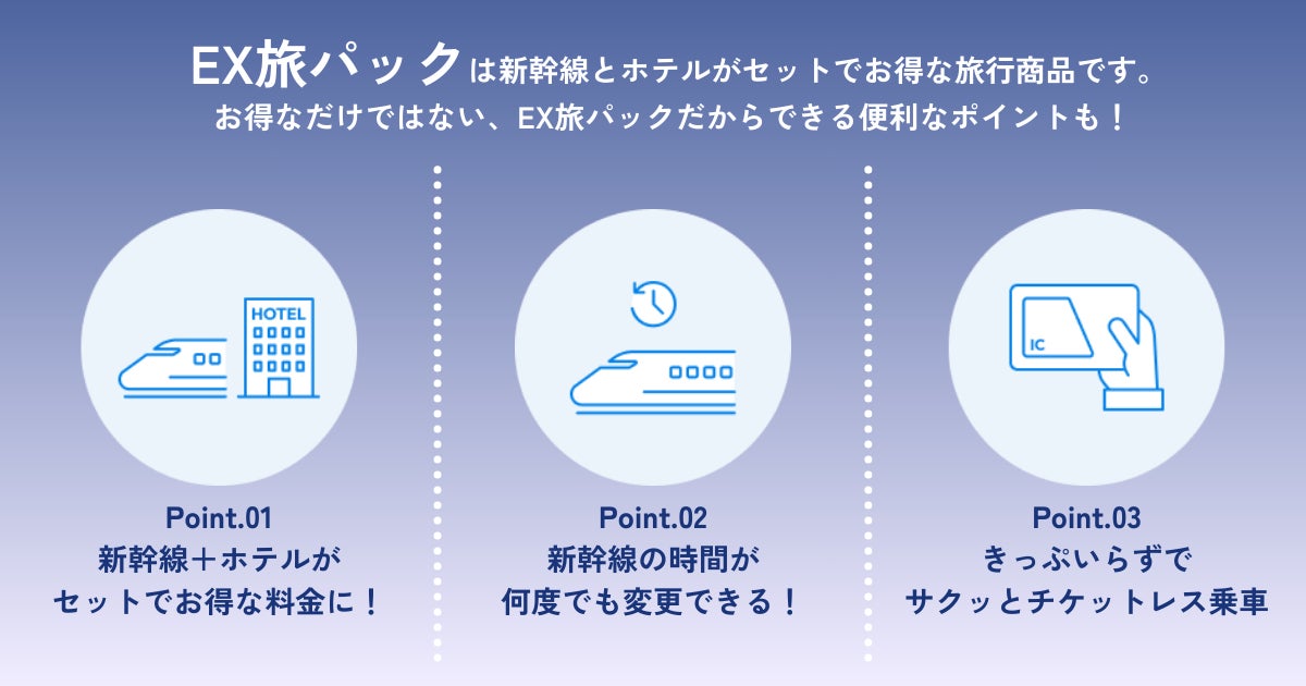 セットプランならではのコストパフォーマンスが魅力の「EX旅パック」。新幹線とホテルを別々に手配するよりもおトク(※)に旅行できます!※EX旅パック商品と個別で手配した場合を比較