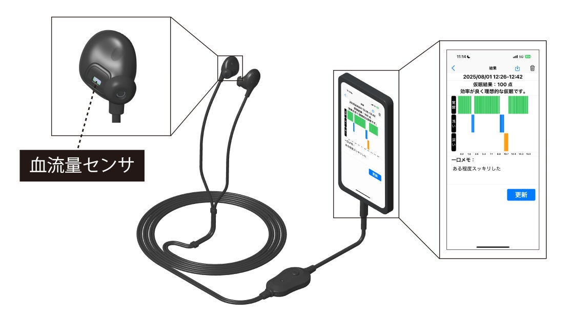 「sNAPout®」は血流量センサを搭載したイヤホンデバイスと、AIを搭載したスマートフォンアプリで構成される仮眠起床システムです。入眠の際は、左右の耳に異なる周波数を流す深睡眠促進音で深い眠りを促します。入眠後は、スマートフォンアプリに内蔵されたAIが血流量データにより高精度かつリアルタイムで睡眠状態を解析。最適なタイミングでアラームを鳴らし仮眠からの起床を誘導します。