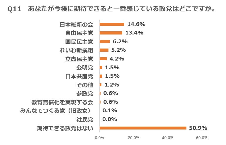 自身が最も今後に期待できないと感じる政党は自民41.0%が最多で、2位はれいわ11.2%だった。「今後期待できる」から「今後期待できない」を引いたポイント差は、維新が10.2で最も高く、自民はマイナス27.6で最低だった。(Q12)