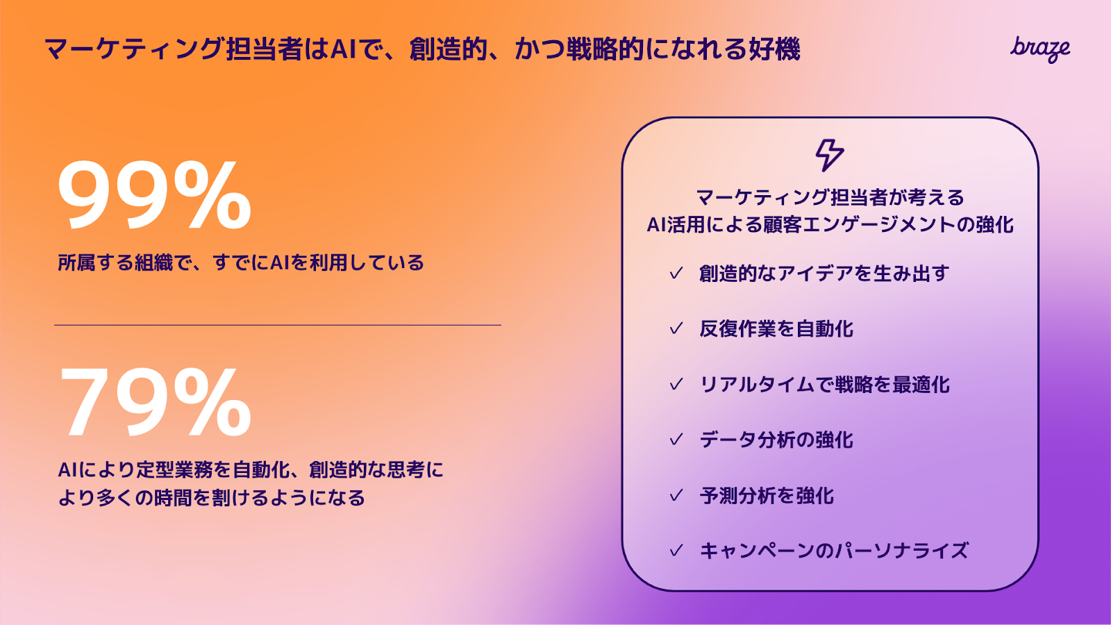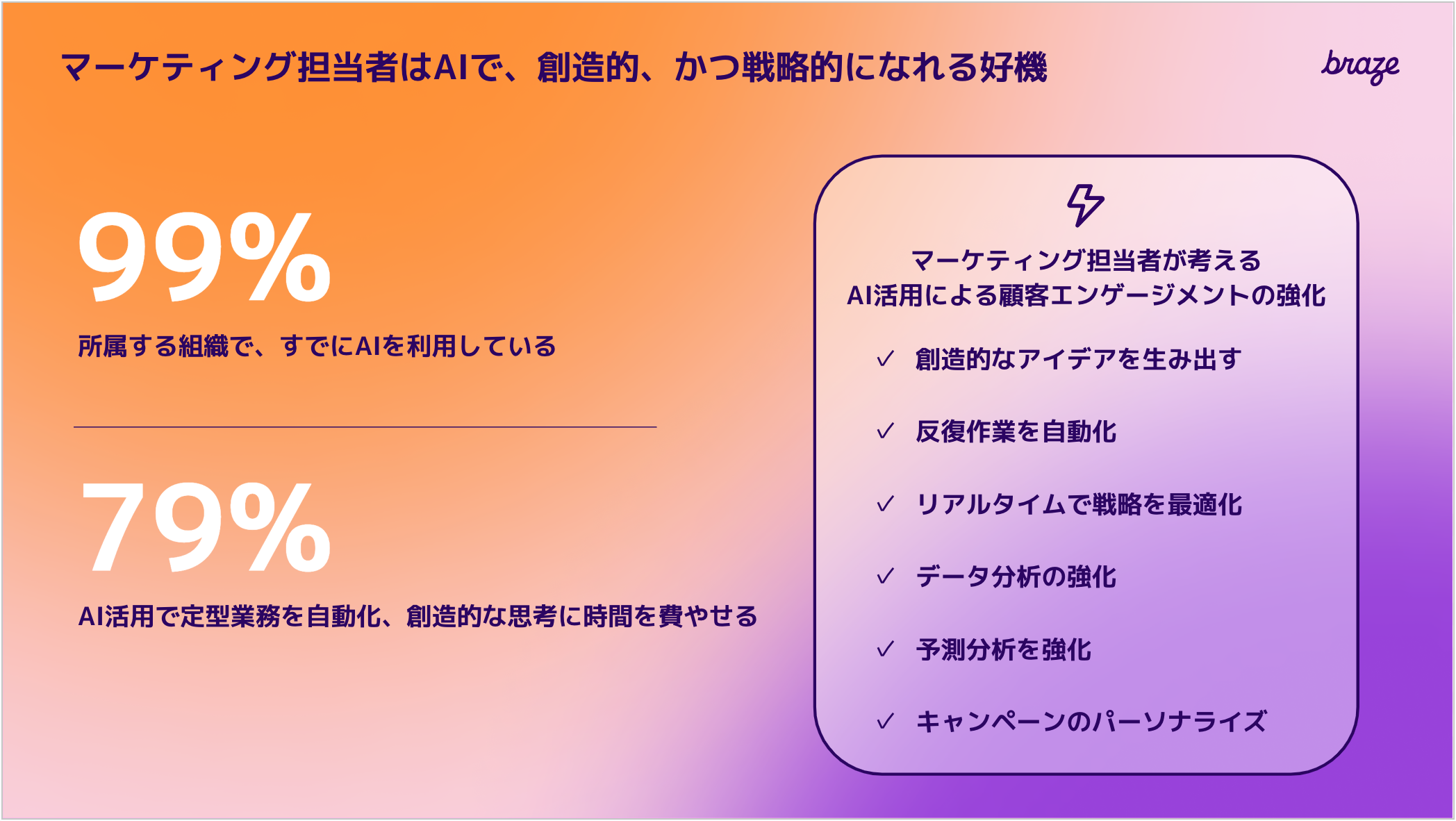 Braze は、ブランドが「Be Absolutely Engaging」を実現するカスタマーエンゲージメントプラットフォームです。Braze の活用で、マーケティング担当者はあらゆるデータソースから、データを収集、施策実行ができ、1 つのプラットフォームからマルチチャネル、かつリアルタイムに、顧客とパーソナライズされたコミュニケーションができます。さらにAIで仮説検証と最適化を繰り返しながら、大量配信を支援するスケーラビリティーで、ハイパーパーソナライゼーションを実現し、ブランドに熱狂するファンとの魅力的な関係を構築、維持できます。同社は、2024 年の米国ニュースで働きがいのあるテクノロジー企業に選ばれ、英国の Great Place to Work 誌で 2023 年の女性にとって最も働きやすい職場に選ばれ、ガートナー の 2023 年マジック クアドラント でマルチチャネル マーケティング ハブおよびマーケティング ハブのリーダーに選ばれました。 The Forrester Wave: クロスチャネル マーケティング ハブ、2023 年第 1 四半期。Braze はニューヨークに本社を置き、北米、ヨーロッパ、APAC に 10 以上のオフィスを構えています。詳細については、braze.com をご覧ください。