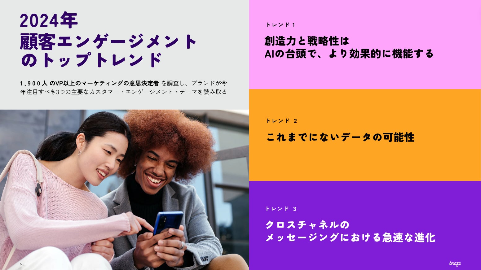 詳細の内容は「2024年 グローバルカスタマーエンゲージメントレビュー(日本語版)を( https://www.braze.co.jp/resources/reports-and-guides/2024-global-customer-engagement-review ) 」でご紹介しています。