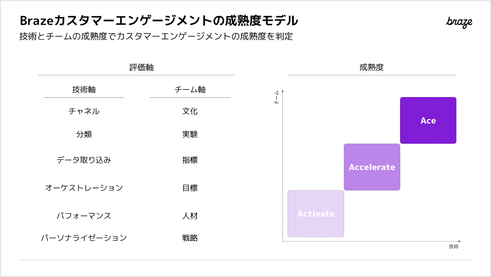 Braze顧客エンゲージメント指数は「テクノロジー」と「チーム(組織)」の2つの重要な軸で構成され、合計12項目で指数化されています。成熟度が高い方からAce(エース)、Accelerate (アクセラレート)、Activate(アクティベート)という、3つの成熟度レベルに分解されています。