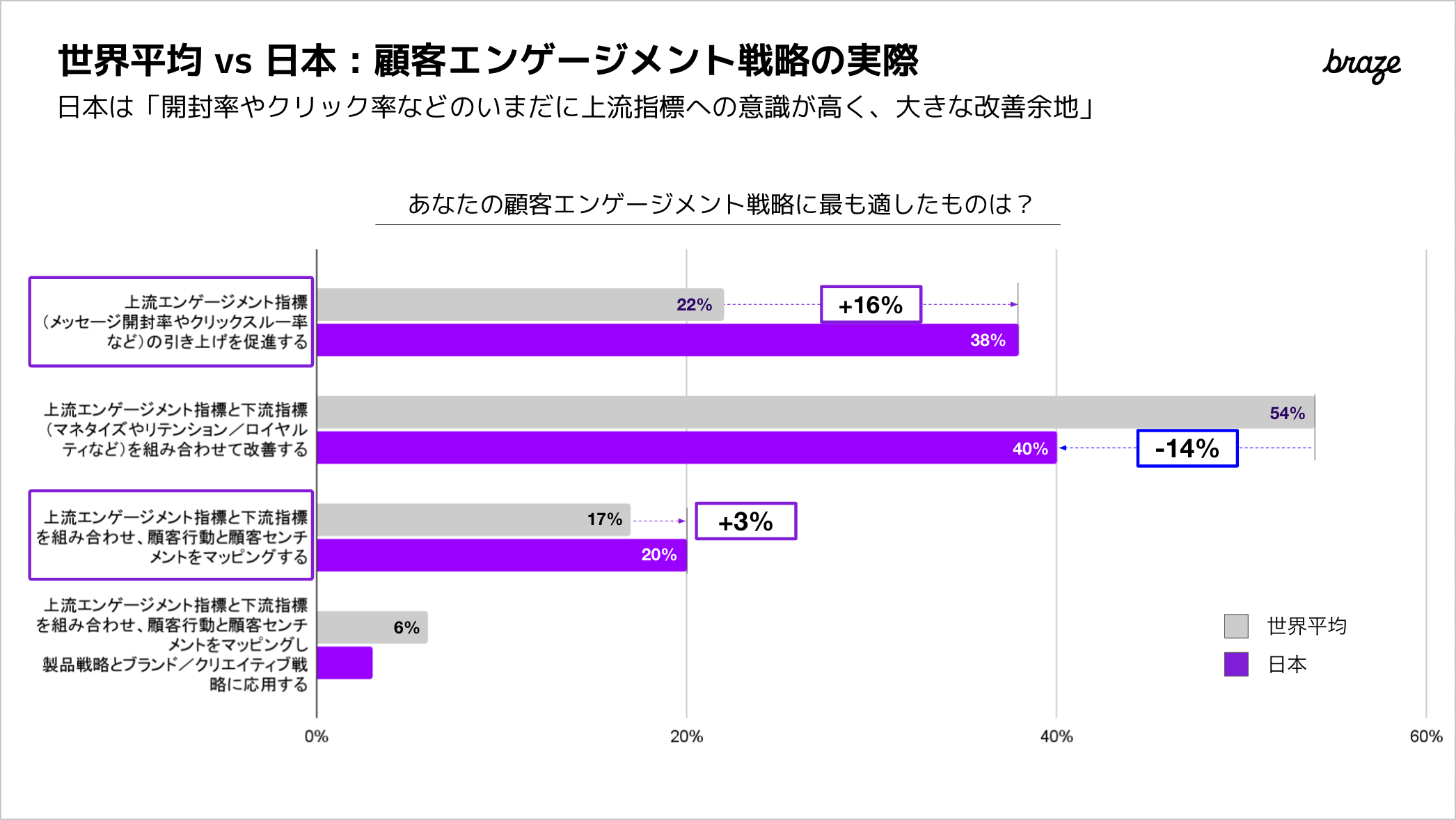 「あなたの顧客エンゲージメント戦略に適したものは?」という問いに対する回答は、世界では「マーケティングファネルの上流と下流を組み合わせマネタイズやロイヤリティを組み合わせた改善」が一般的なのに対し、日本は「上流のメッセージ開封率やクリック率などに注目する傾向が強い(世界平均+16%)」ことが明らかとなりました。日本の場合、新規顧客や認知向上を目的に広告施策を顧客エンゲージメントの活動と考える企業が、依然として多いことを示しているかもしれません。ただ、「上流と下流を組み合わせ、さらに顧客行動と顧客センチメントも意識したエンゲージメント戦略を取る(世界平均+3%)」という結果もあります。日本の顧客エンゲージメント先進企業は、上流下流のマネタイズやロイヤリティに加え、感情を捉えた動きを進めており、世界でもトップランナーとも言えそうです。