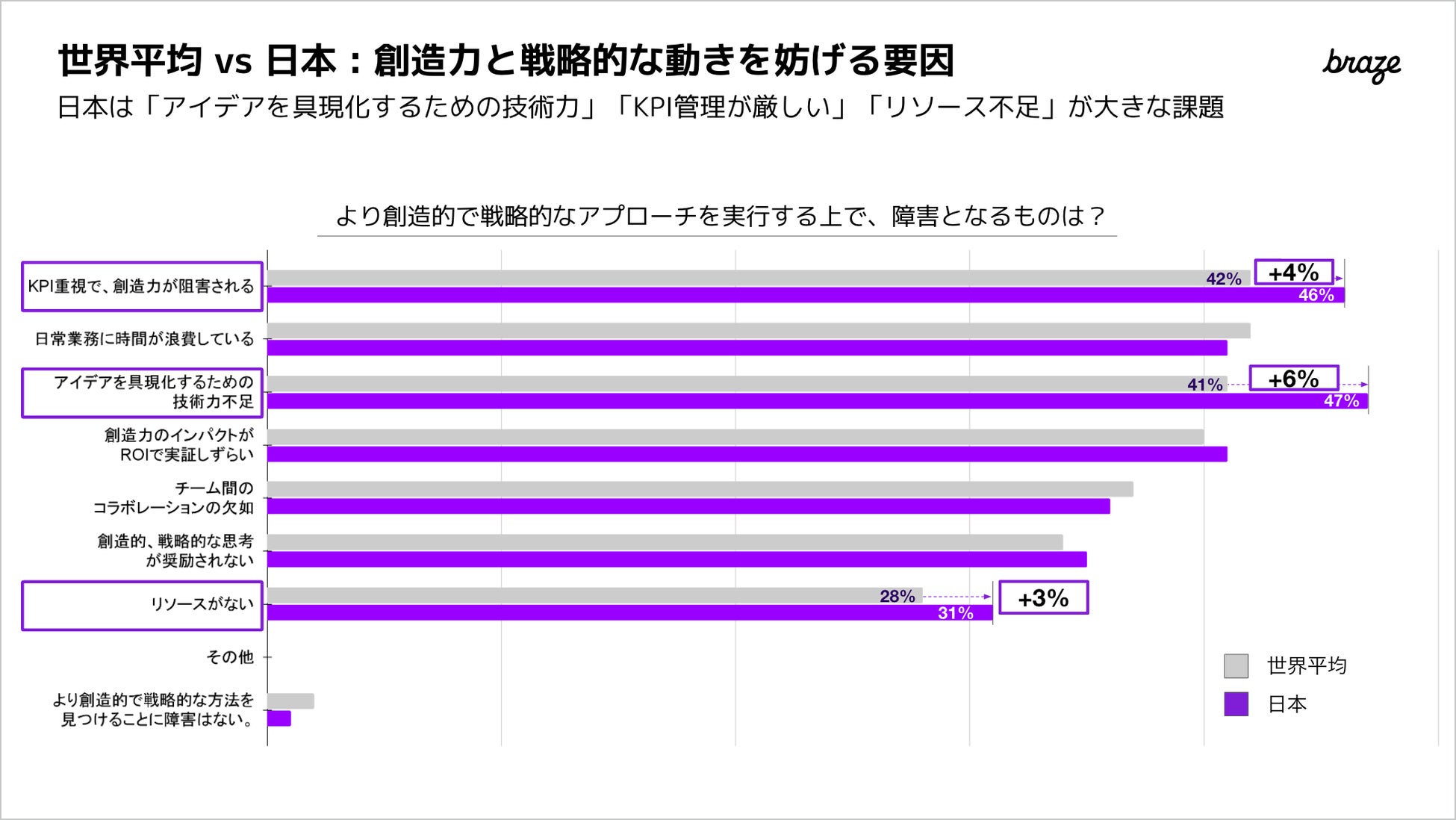 「より創造的で戦略的なアプローチを実行する上で、障害になるものは?」の問いに対する回答を世界と日本で比べると「アイデアを具現化するための技術力(世界平均比+6%)」、「KPI重視で創造力が阻害される(世界平均比+4%)、「リソースがない(世界平均+3%)」が日本は高めの回答となりました。AIが社内や社会に浸透する中で、創造力と戦略性の双方が求められる業務シフトが進めば、アイデアを具現化する技術力も強化されていく、と考えられます。