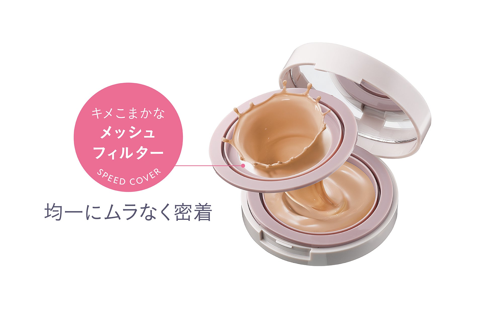 クッションタイプだからこその均一な薄膜、付属の指パフで、肌補正アプリ級美肌を簡単に叶える。
