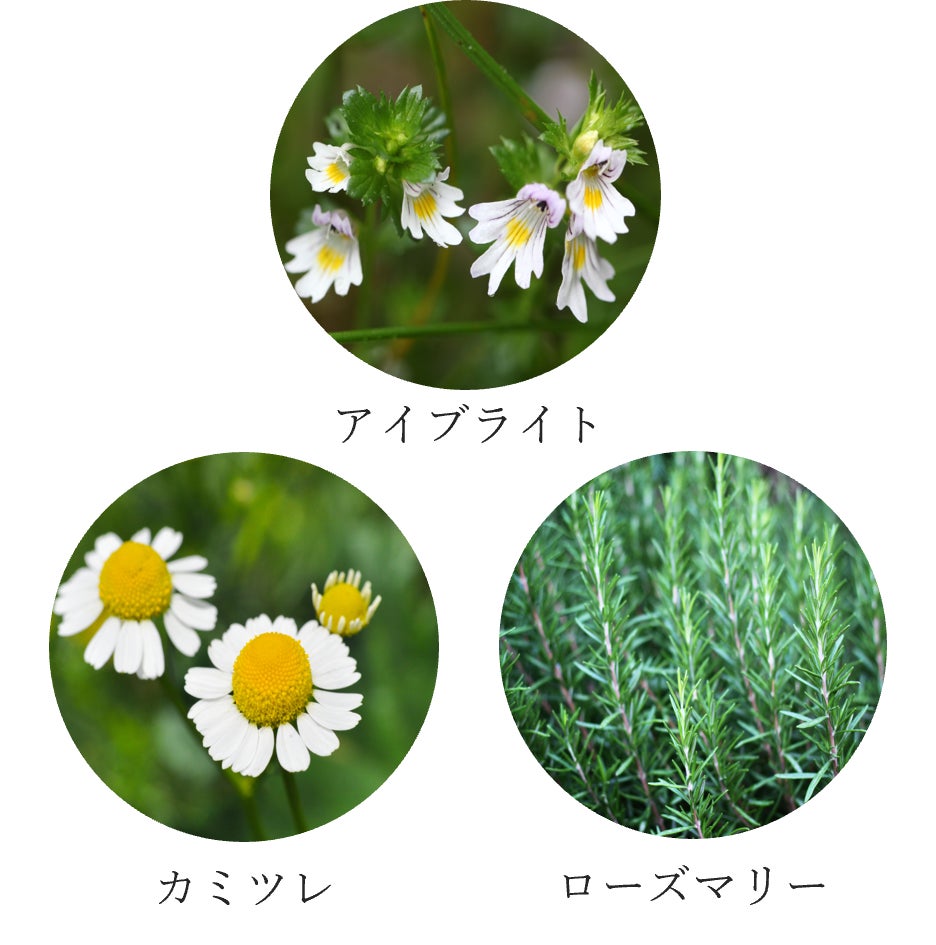 こだわりのボタニカル成分「アイブライトエキス(整肌成分)」「カミツレ花エキス(整肌成分)」「ローズマリー葉エキス(ハリ成分)」を配合。デリケートな目もとを乾燥などによるダメージから守り、みずみずしい潤いを与えます。