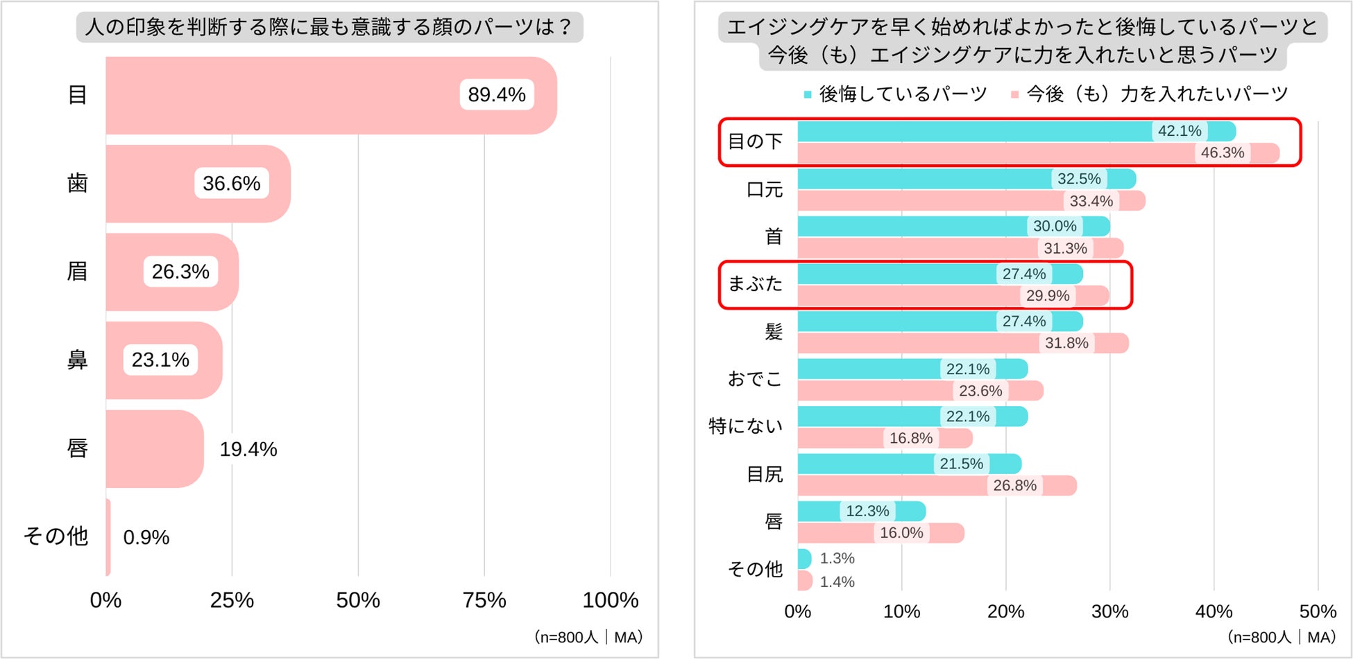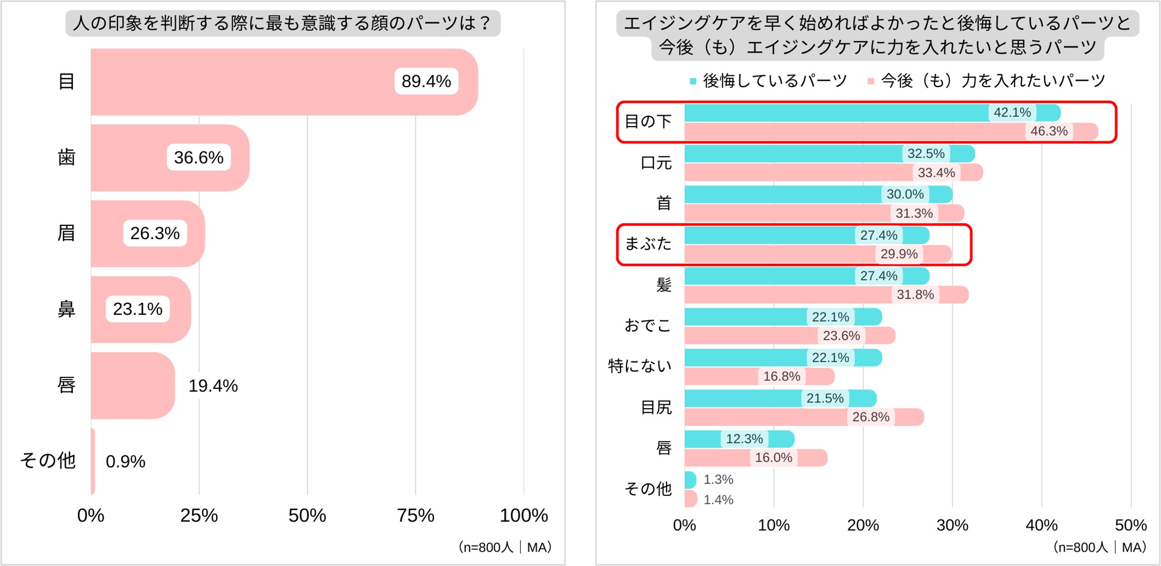 当社が行なった調査では、人の印象を判断する際に最も意識する顔のパーツの圧倒的1位は「目」89.4%。また、女性の96.6%が目もとに悩みを持ちながら、実際に目もとケアアイテムを使用している人は全体の約14%のみということがわかっています。それを象徴するように、女性がエイジングケア*2をもっと早く始めればよかったと後悔しているパーツの1位は「目の下」で、今後(も)力を入れたいパーツの1位も同じく「目の下」でした。「まぶた」に関しても、後悔しているパーツ/力を入れたいパーツともに上位にランクイン。目もとは顔の印象を左右するだけに、ユーザーが特に注力してケアしたいパーツということがわかりました。