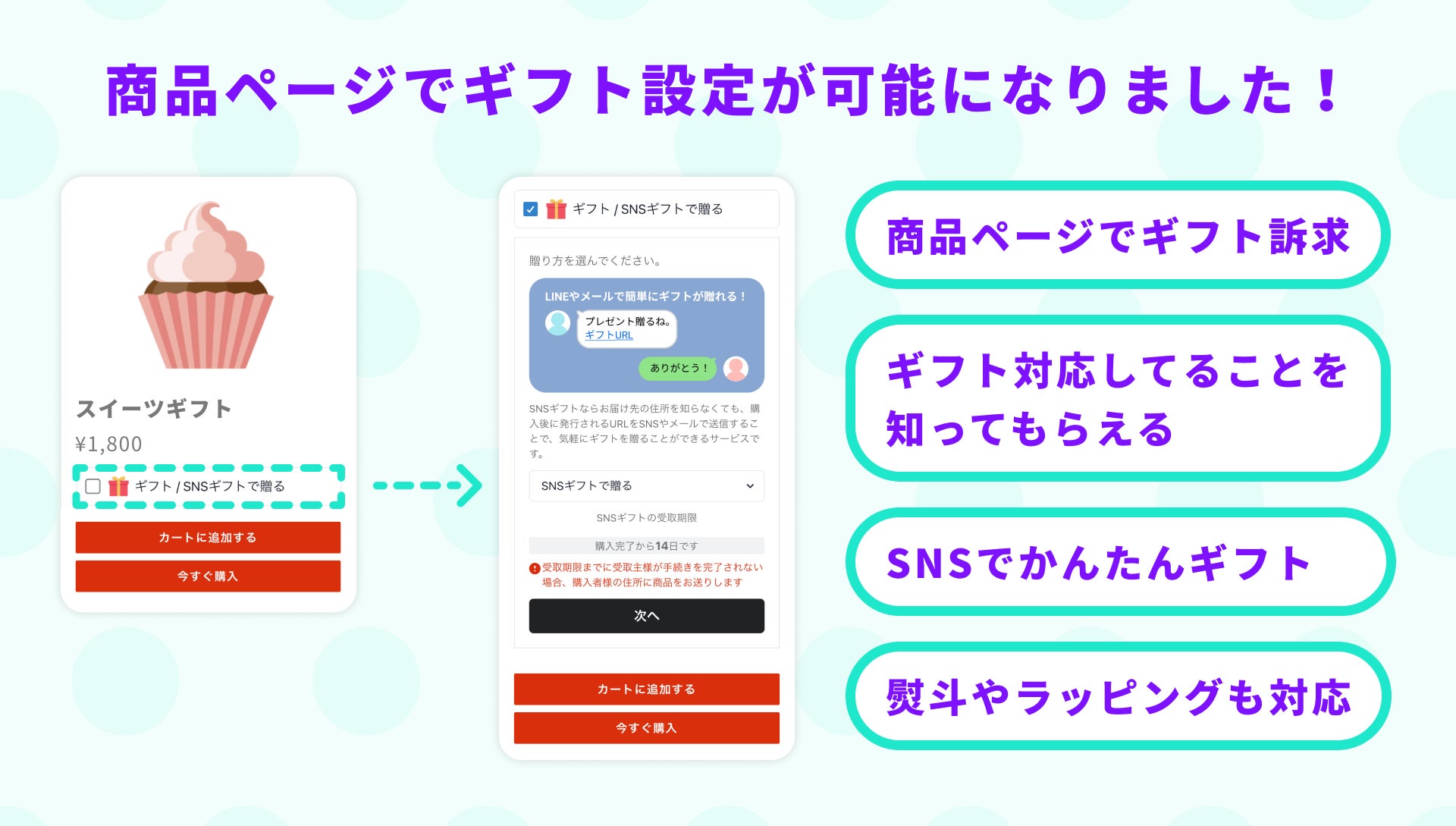 今までカート画面でのみギフト設定が可能でしたが、マーチャント(店舗)様からも多くのご要望をいただき、商品ページからも設定ができるようになりました。