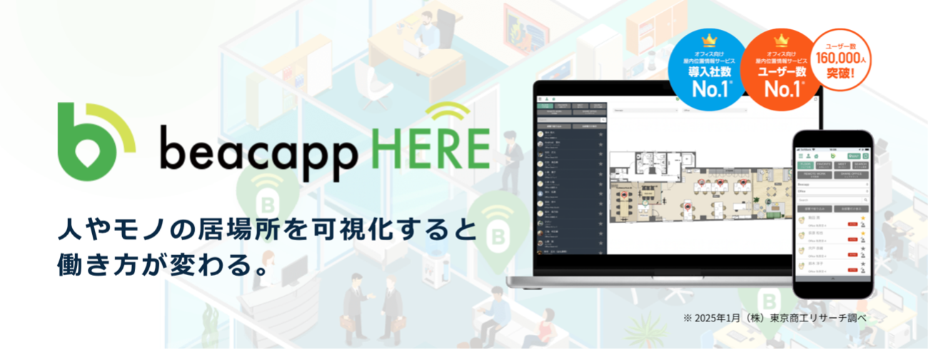 ※1東京商工リサーチ調べ「オフィス向けリアルタイム位置情報サービス部門累計導入社数、導入数、ユーザー数」第1位(2025年1月末時点)