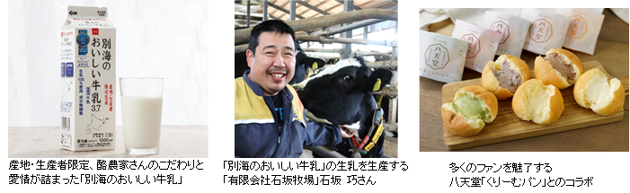 多くのファンを魅了する八天堂のくりーむパンと、ベイシアの大人気商品「別海のおいしい牛乳」が究極のコラボ。カスタードクリームに「別海のおいしい牛乳」のフリーズドライ原料を使用することで、「別海のおいしい牛乳」本来のすっきりとしたコクと甘さが感じられる特別なくりーむパンです。「別海のおいしい牛乳」のファンの方にはもちろんのこと、こだわりのパンが好きな方にぜひ召し上がっていただきたい商品です。