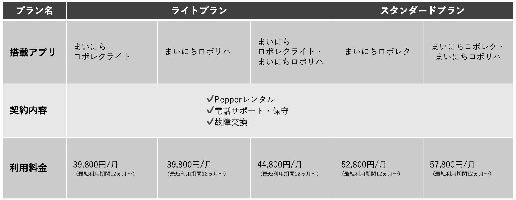 このたび、Pepper利用施設からのフィードバックをもとに、プランをリニューアルし、介護施設のニーズに合わせて選べる5つのプランを公開しました。既存のアプリから、カスタム機能を除いた「まいにちロボレク ライト」を追加し、より気軽にPepperを導入いただけるプランも提供します。