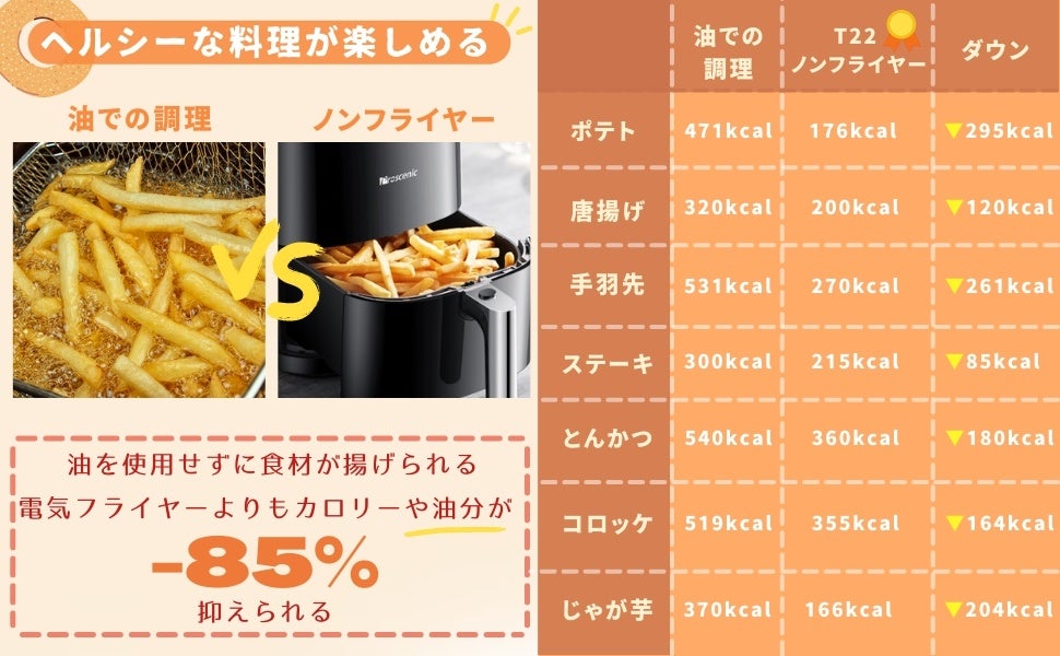 - 【ASH2.0-テクノロジー】T22ノンフライヤーは360°立体的な「3D HF循環」技術を採用して、調理する際に脂肪分を85%をカット、食材を均一に加熱できます。通常の空気循環技術に比べ7倍の効率があるため、調理効果が30%向上し、すばやく肉汁を閉じ込めます。