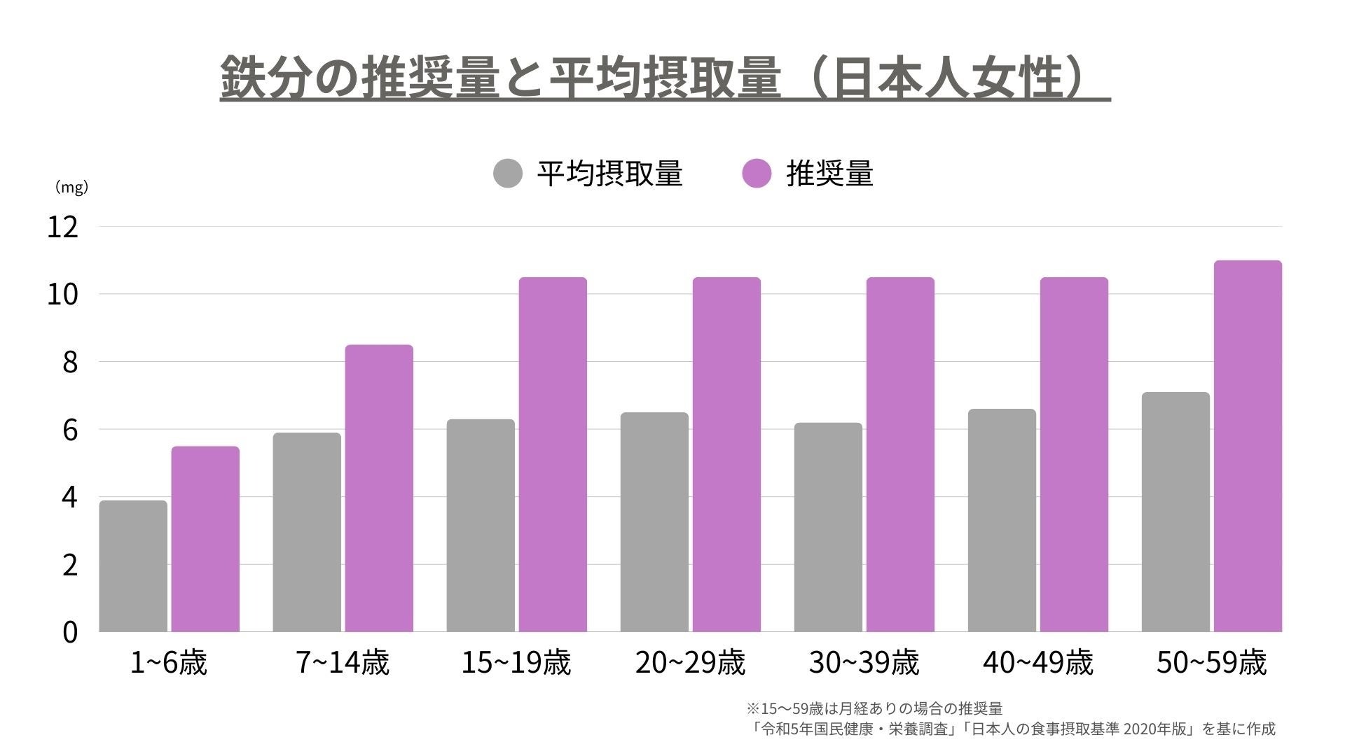 令和5年「国民健康・栄養調査」の結果によると、日本人の鉄分平均摂取量は推奨摂取量を下回っていることがわかります。