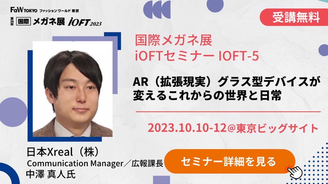 AR(拡張現実)グラスを開発・販売している、日本Xreal株式会社(代表取締役社長:呂正民/所在地:東京都港区)のCommunication Manager/広報課長 中澤 真人が、2023年10月10日から東京ビッグサイトにて開催されます日本最大のファッション展「FaW TOKYO (ファッション ワールド 東京)」のiOFTセミナーにて登壇いたします。