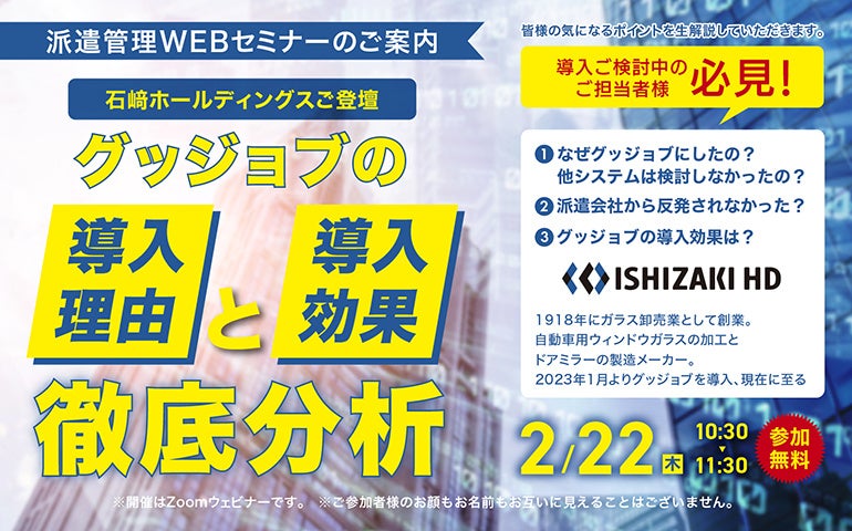 タイトル:【派遣先企業様向け】石﨑ホールディングス様ご登壇 グッジョブの導入理由・導入効果を徹底分析