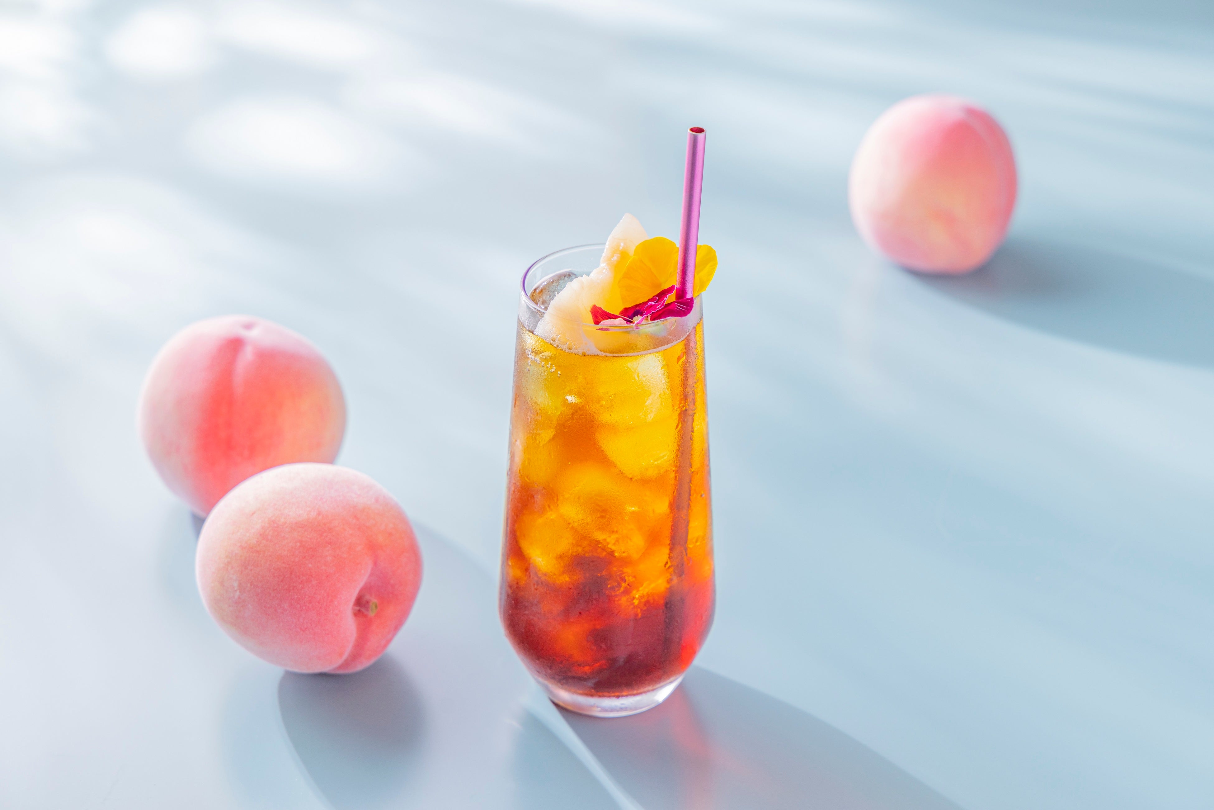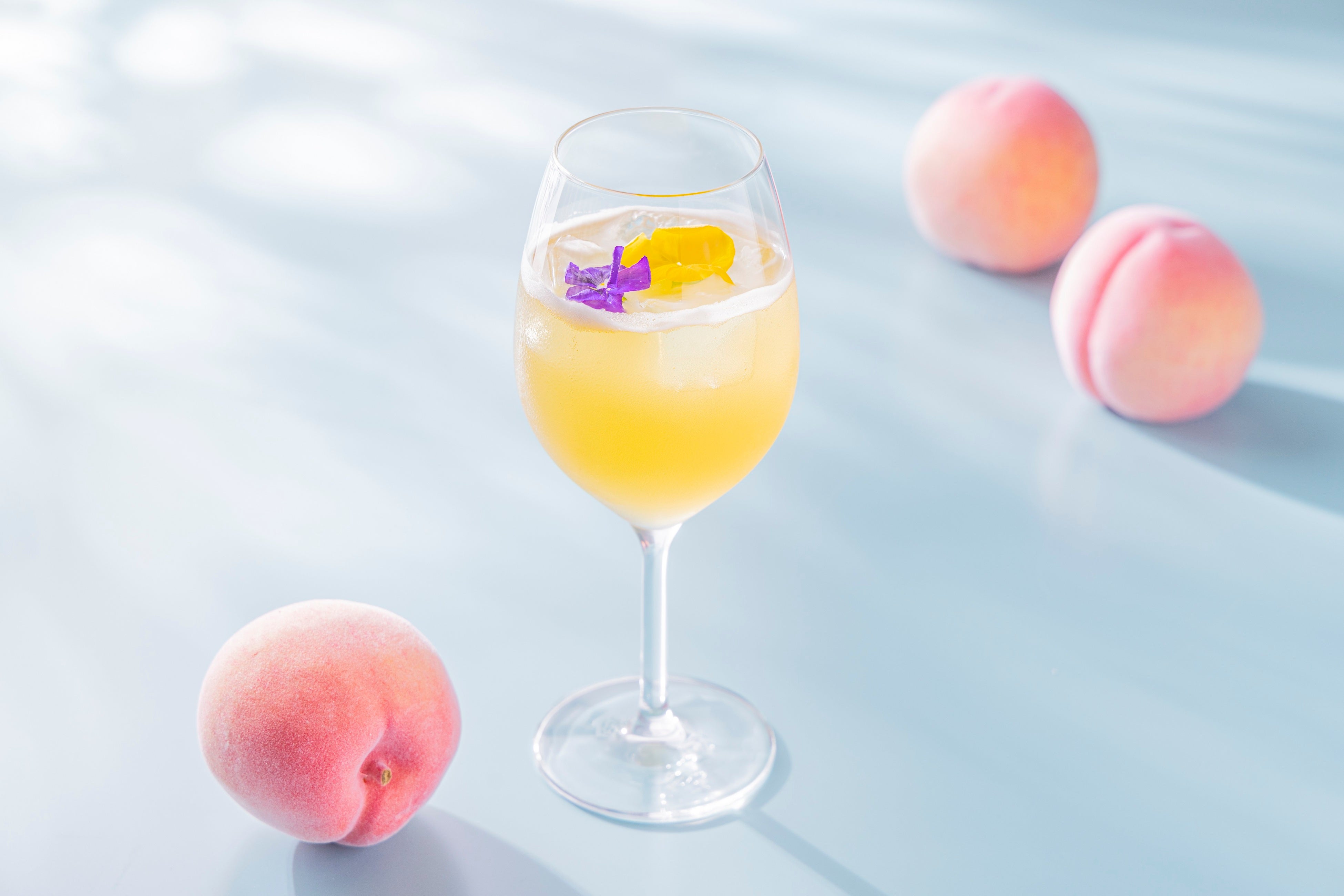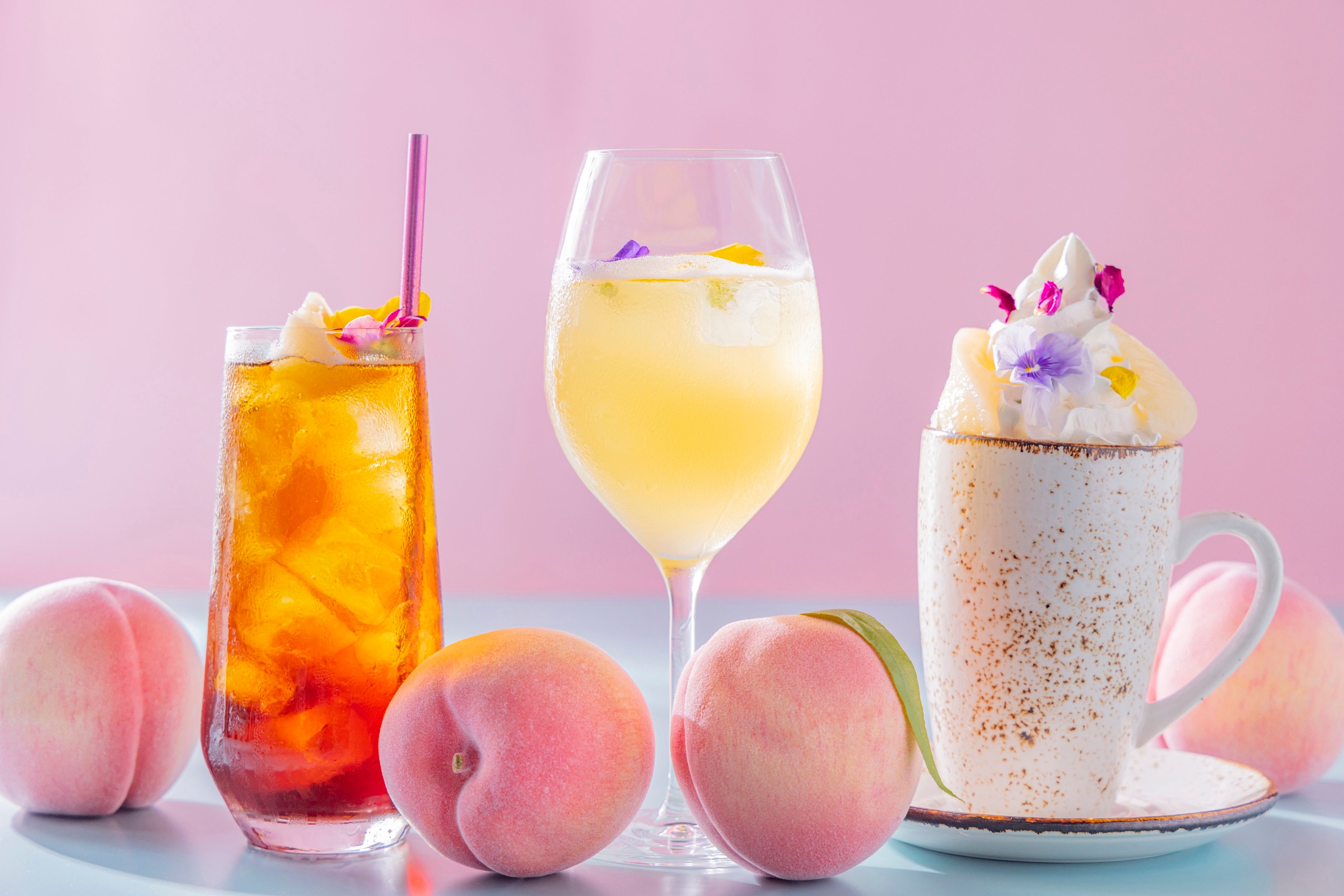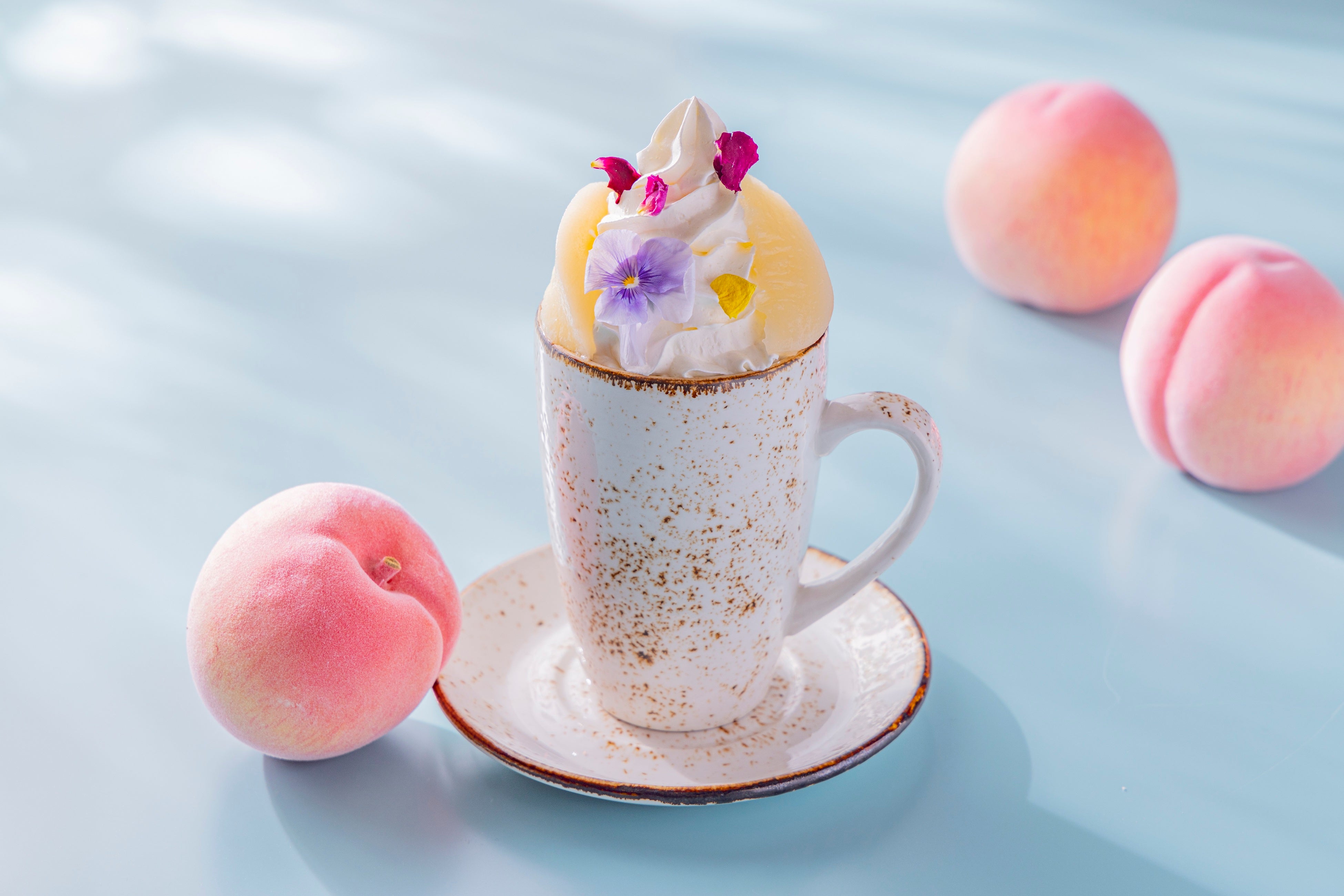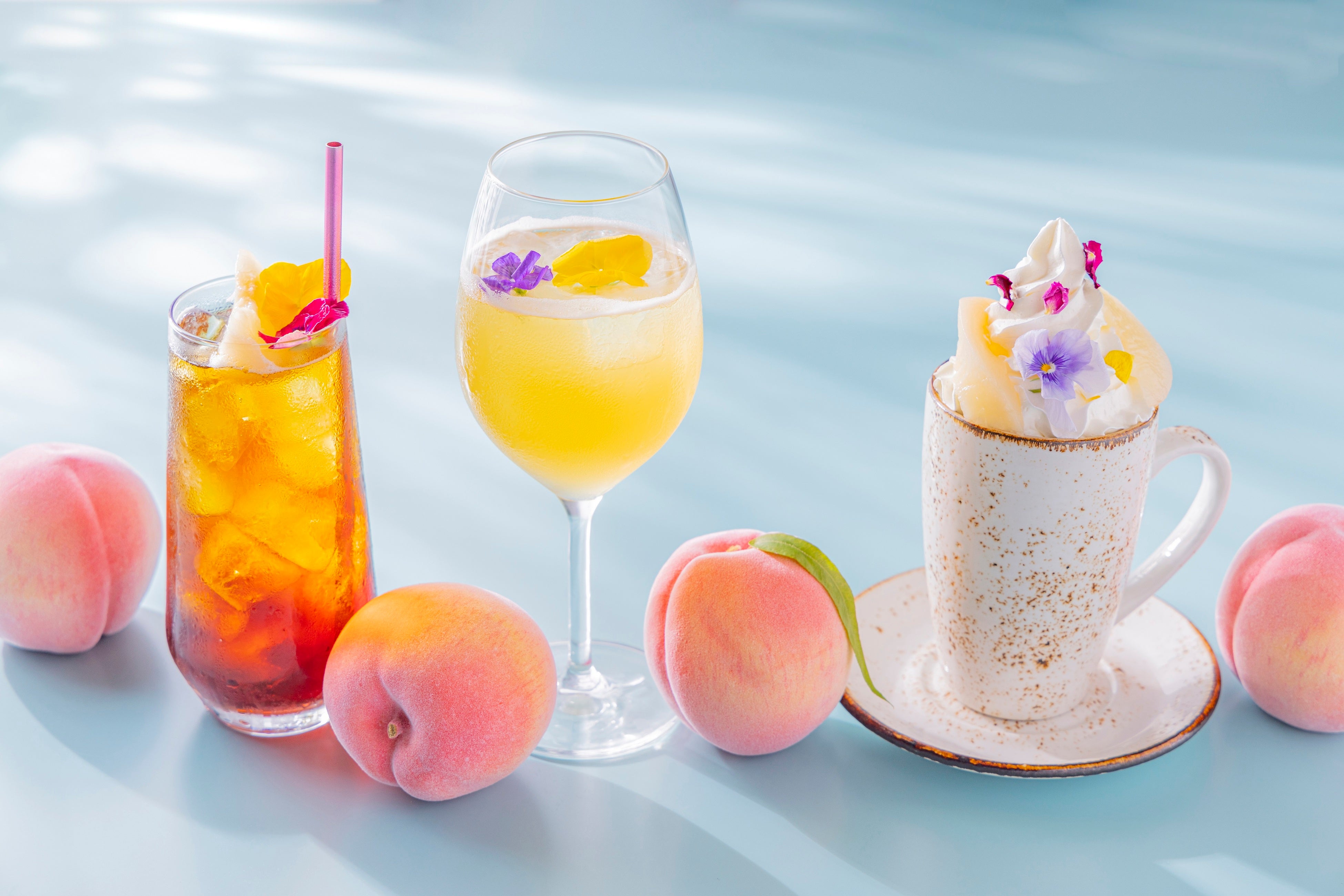 この夏限定の#クロッフルと合わせたピーチフレーバーの、見た目にも可愛いドリンク3種とPEACH JOHNのロゴが入ったカフェラテもご提供いたします。ぜひ、ピーチメルバクロッフルとセットでどうぞ。