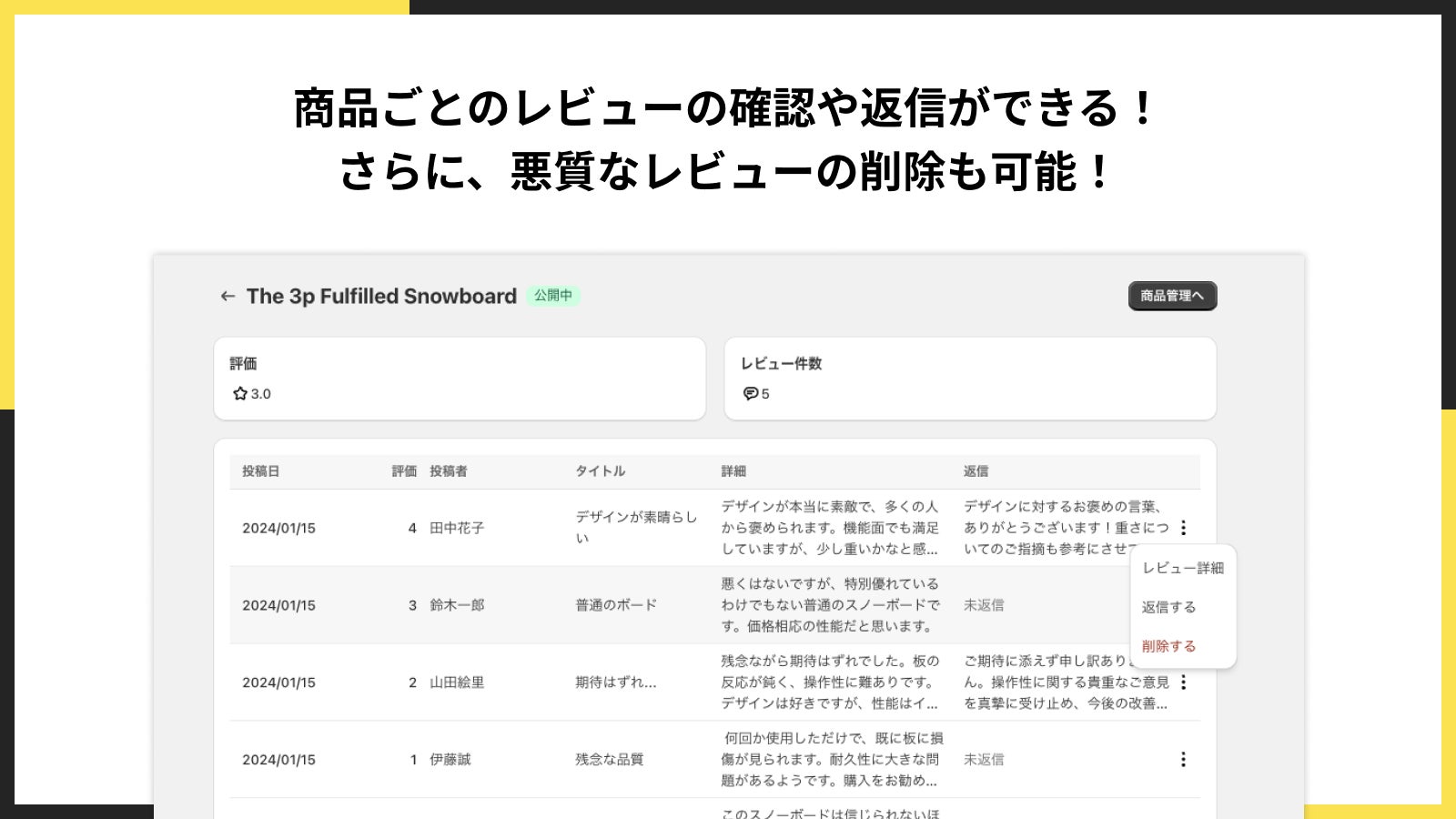 ■商品ごとのレビューの確認や返信ができる!さらに、悪質なレビューの削除も可能!