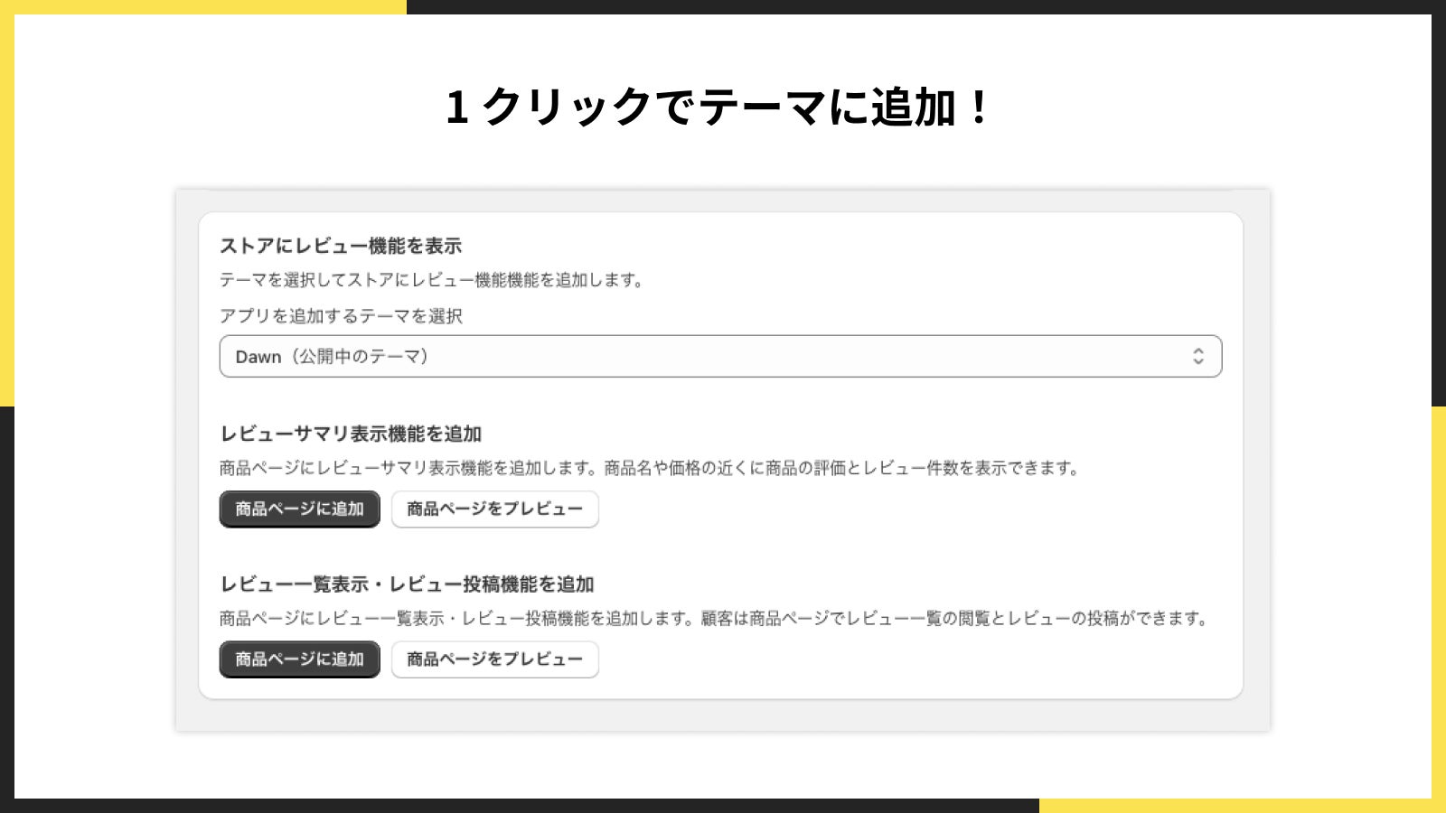 「シンプルレビュー|お手軽口コミ」は、1クリックでテーマに追加できます。簡単に商品ページにレビュー機能を導入できます。不慣れな方でも安心してご利用いただけます。