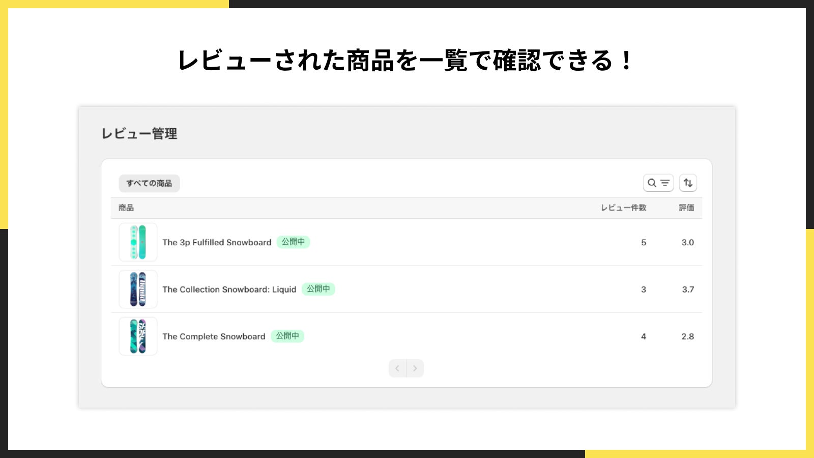 「シンプルレビュー|お手軽口コミ」は、管理画面の「レビュー管理」ページでレビューされた商品を一覧で確認できます。これにより、ストア運営者は、レビューされた商品の状況を一目で確認できます。
