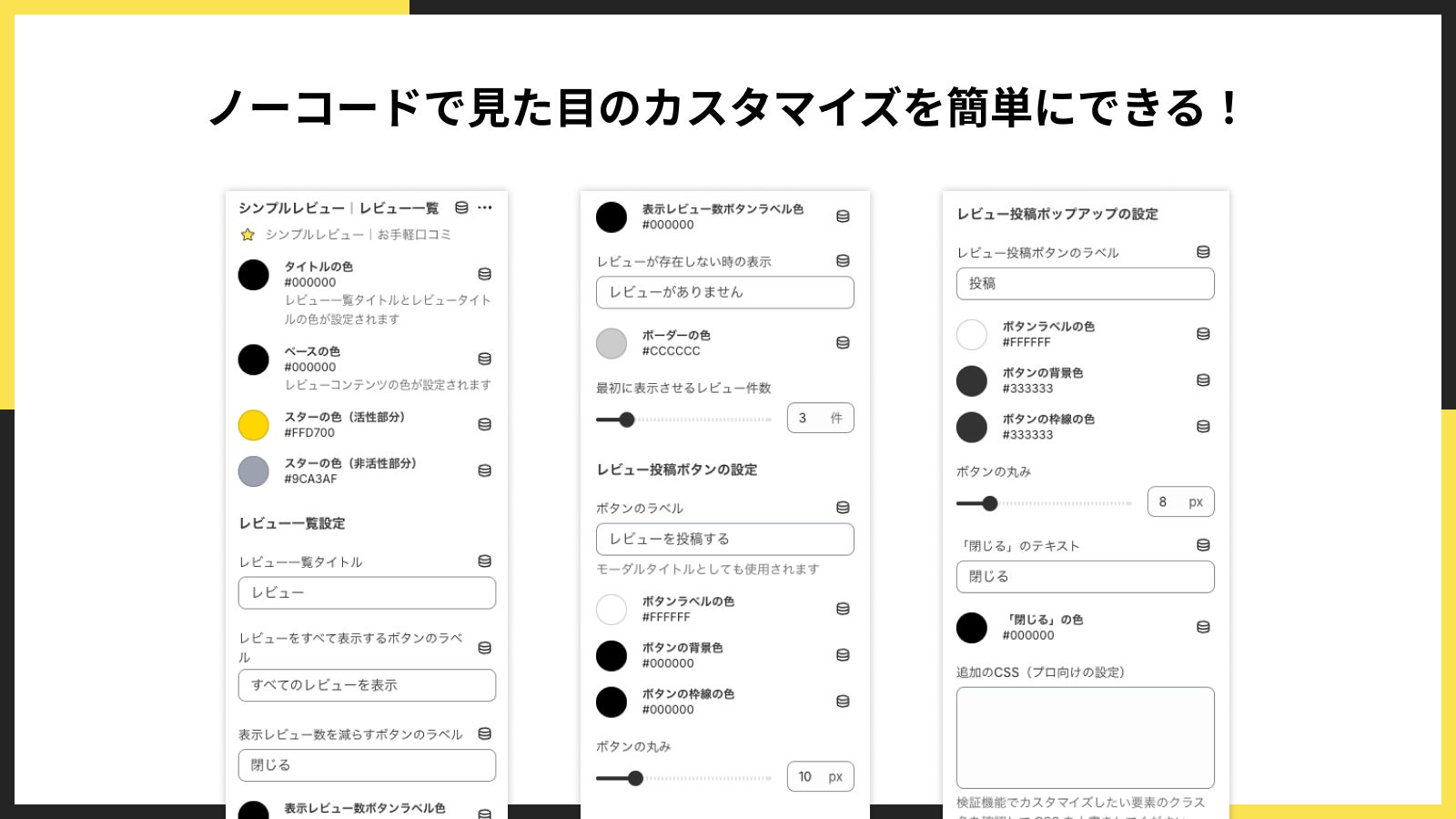 「シンプルレビュー|お手軽口コミ」は、ノーコードで見た目のカスタマイズが簡単にできます。テキストやボタンなど様々なカスタマイズができるため、実現したいストアに合わせたデザインを簡単に実現できます。