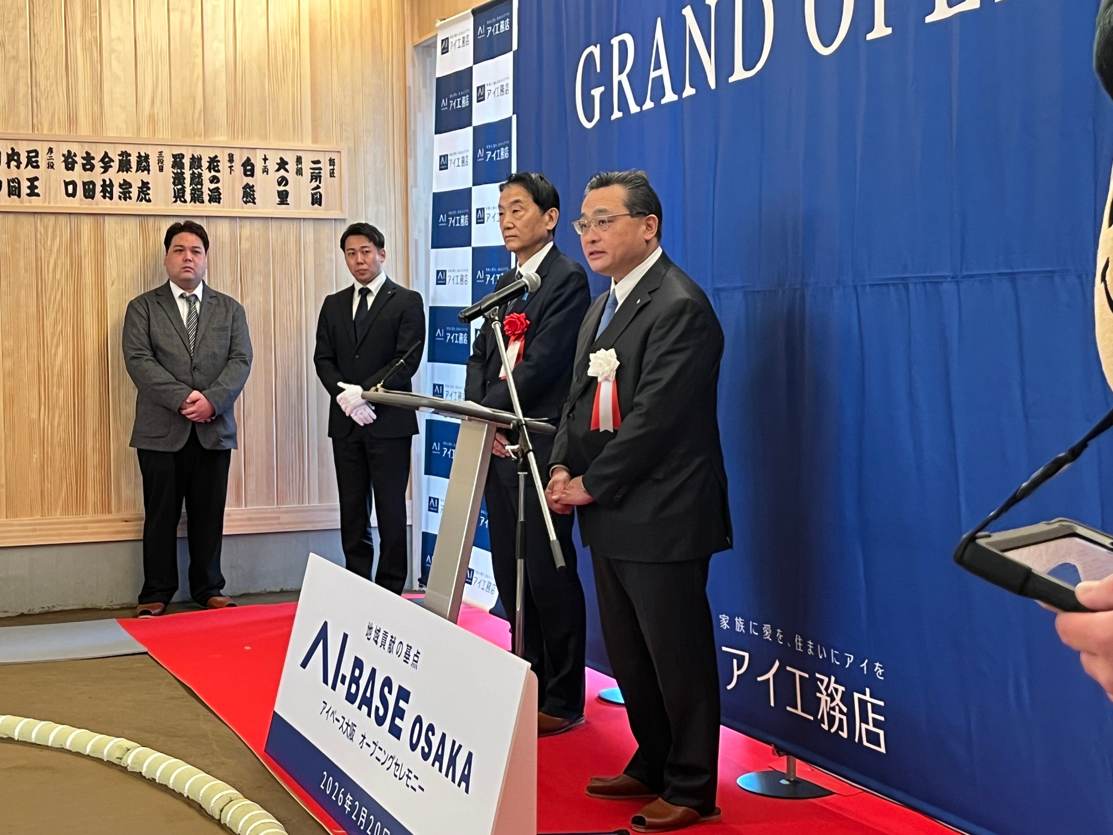 全国で良質な住宅事業を展開されるアイ工務店様と包括連携協定を締結し、アイベース大阪を設置いただきましたことに心より感謝申し上げます。昨年はふるさと納税を通じてスポーツ振興など多方面でご支援を賜りました。本市は「子どもファースト」を掲げており、学習支援をはじめとする取り組みの拠点として活用できることを大変心強く感じております。観光振興や災害時の連携にも期待しております。春場所で二所ノ関部屋が本施設を使用されることを誇りに、ワンチームで夢と安心を創ってまいります。