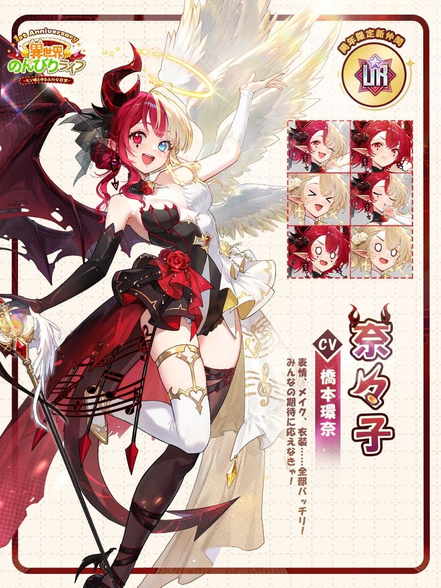 新UR☆仲間、異世界初のミュージカル女優「奈々子」が華麗に登場!時に妖しく悪魔のように、時に清らかで天使のように——その変幻自在な演技と魅力で、すべての観客を魅了します。新感覚のミニゲームも同時登場。天使と悪魔、ふたつの個性がぶつかり合う消しごたえを楽しみながら、イベントミッションをクリアして豪華報酬を手に入れよう!