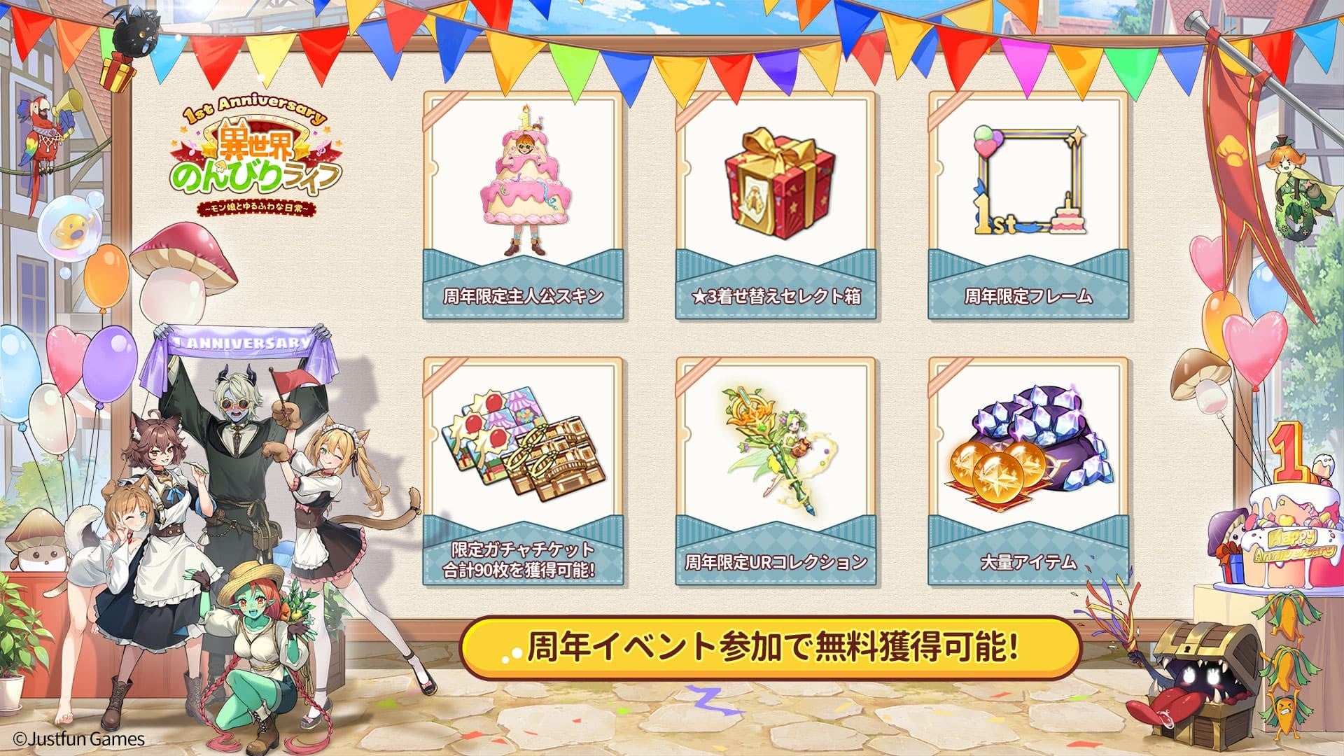 ゲームのサービス開始1周年を記念して、公式特別イベント「ケモミミ村大感謝祭」を開催します。キャラクターの見た目を変える周年限定スキンが登場し、過去の人気着せ替えの復刻セレクトも同時オープン。さらに、ゲーム進行に役立つ様々なアイテムやスタンプを入手できるチャンスを創出してくれる屋台の新たな楽しいキッチンカーコンテンツ、「キッチンカー経営」がオープンします。異世界の美食を作りながら、料理車経営の楽しさを体験しよう!今ログインすると、最大5,000連ガチャを獲得できる、この周年祭をみんなで盛り上げよう!