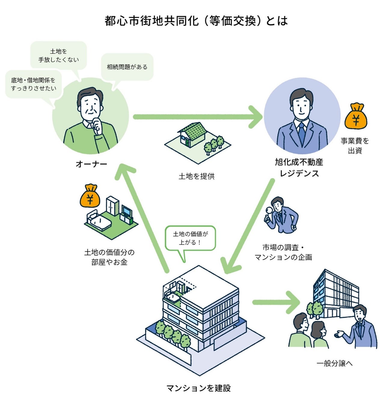 権利者様からは土地を提供いただき、デベロッパーが事業費を出資してマンションを建設、土地の価値比率に応じて権利者様にマンションを分配する方式が等価交換です。「居住を続けたい・店舗/賃貸を同じ土地で経営し続けたい」「土地の権利関係を整理したい」「資金が欲しい」など権利者様ごとに異なる困りごとに対し、旭化成不動産レジデンスでは130 件を超える実績で培った知見でそれぞれの権利者様にとっての最適解を導き出します。