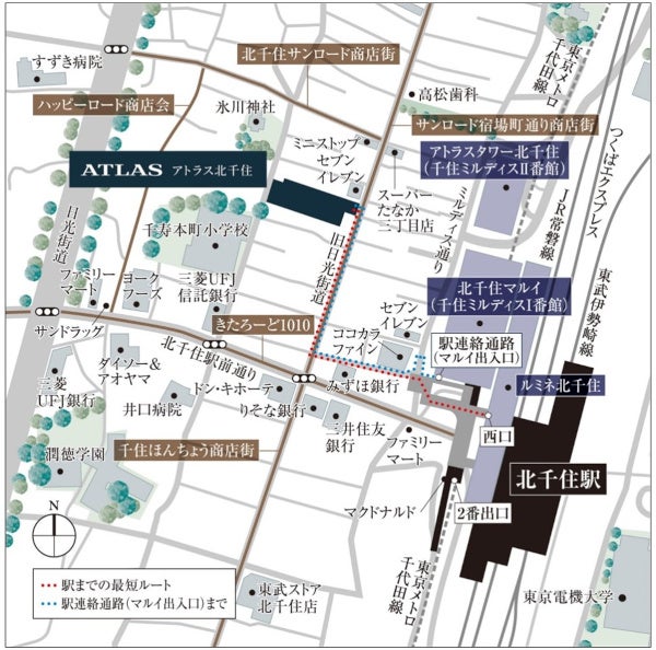 交通 | 東京メトロ千代田線・日比谷線「北千住」駅2出口 徒歩5分 JR常磐線・東武伊勢崎線・首都圏新都市鉄道つくばエクスプレス「北千住」駅西口 徒歩5分 |