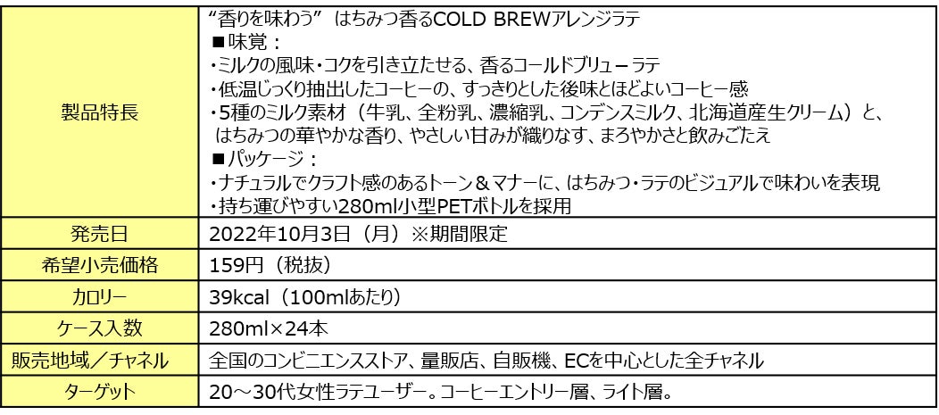 この秋、『UCC COLD BREW』 ブランドから、ラテと相性の良いはちみつをアクセントとした、この時期にぴったりの優しい甘さが嬉しいアレンジラテ、『UCC COLD BREW ハニーミルクラテ PET280ml』 を発売します。本製品は、『UCC COLD BREW』 ブランドの特長である 「低温じっくり抽出※」 で、コーヒーの香り高さと、苦味・雑味のない、すっきりとした後味を引き出しています。さらに、5種のミルク素材をブレンドすることで、しっかりとした飲みごたえとまろやかな口当たりのミルク感を楽しめ、はちみつの華やかな香りと優しい甘みが広がります。パッケージは、白を基調としたナチュラルでクラフト感が漂うデザインに仕上げました。 さらに、はちみつやカフェラテのビジュアルで、カフェのイメージを感じられるリラックスできるような世界観を表現しています。