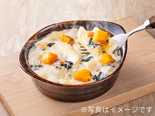 トウモロコシ粉と米粉で作ったペンネと、北海道産の4種の野菜を彩りよくトッピングしたグラタンです。原材料に乳製品を使用せず、豆乳クリーム・豆乳クリームバター・野菜ブイヨンなど植物由来の原材料でコクがありクリーミーな味わいに仕上げました。