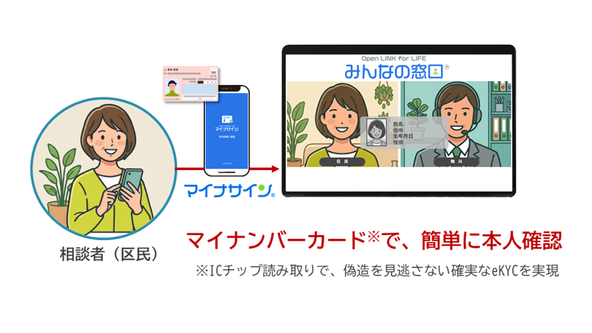 また、当社のマイナンバーカード認証アプリ「マイナサイン® ※」による本人確認・電子署名にも標準対応しており、スマートフォンでマイナンバーカードを読み取るだけで確かな認証が完了し、「相談」と「厳格な認証」を一体化することで、オンライン完結が難しかった複雑な手続きのDXを強力に推進いたします。