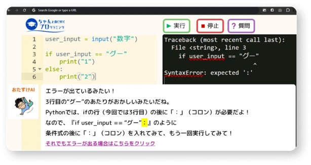 Pythonを使ったプログラムでは、エラーが頻繁に起こります。また、エラーメッセージが英語で出力されるので初めて学ぶ小中学生がつまづくポイントがたくさんあります。ちゃんプロではエラーが発生した瞬間にAIがプログラムを添削してくれる機能を用意しているので、初心者でもつまづかないようになっています。