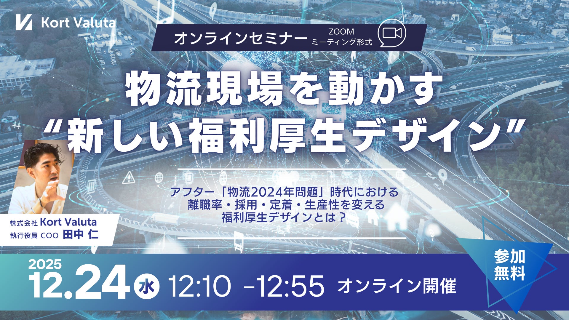 株式会社Kort Valuta(本社:東京都渋谷区、代表取締役:柴田秀樹、以下「当社」)は、物流・運送業界で大きな影響が出ている「物流2024年問題」を背景に、現場の課題と改善のヒントをテーマとしたオンラインセミナーの第二弾を、2025年12月24日(水)に開催いたします。