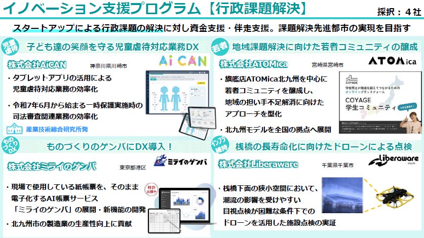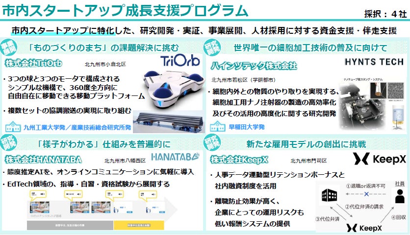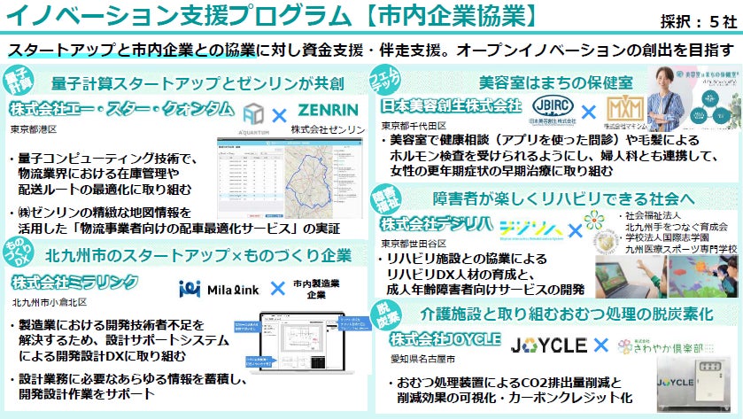 北九州市では、令和6年度から、市内スタートアップに特化した成長支援、スタートアップによる行政課題の解決や市内企業との協業に対する支援を行う「企業変革・スタートアップ・グロースサポート事業」を創設しました。