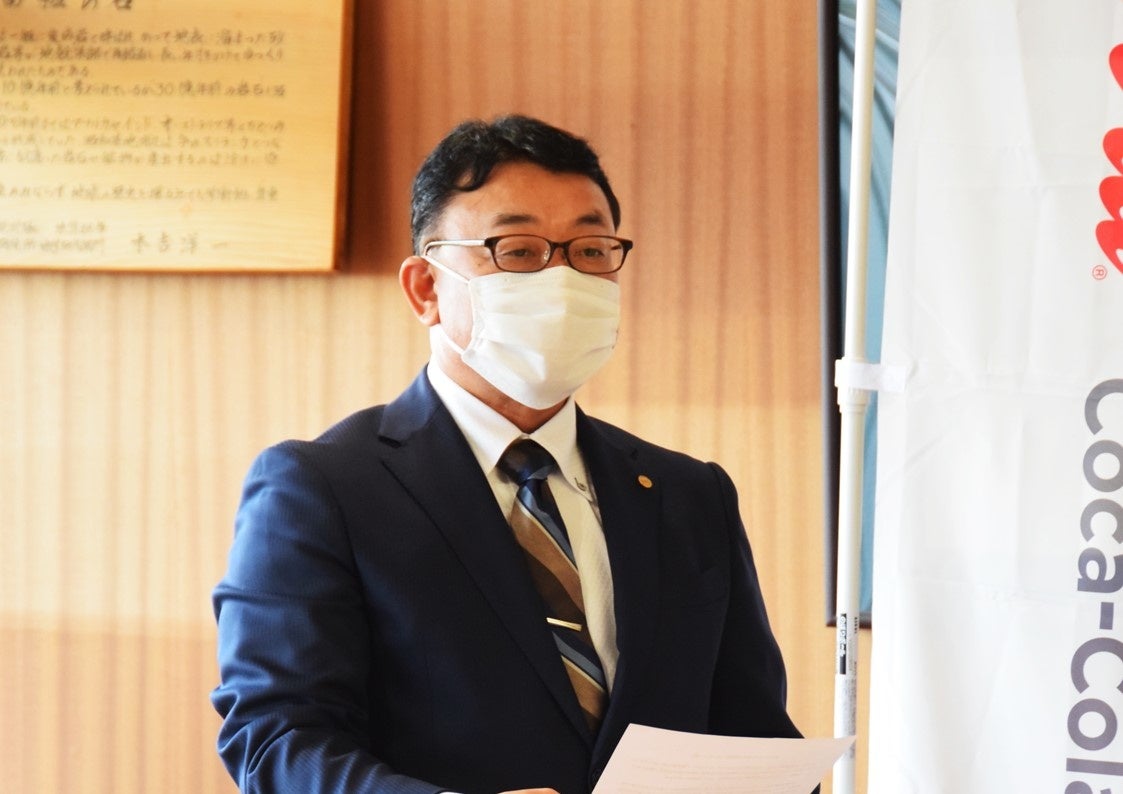 「今年八月に、牛滝地区を襲った大雨による水道施設が被災したことによる断水は記憶に新しく、私も何度か被災地に足を運びましたが、長期化傾向にある災害対応について、特に飲料の重要性を再認識し、これらを確保する手段に乏しいことを痛感いたしました。本協定に基づき、災害現場において飲み物の提供が可能になることは、村民の命をつなぐ非常に重要なことであり、過酷な断水生活を余儀なくされている村民が、非常時にあっても、普段と変わらぬ生活を続けられる、いわば『命の水』となるものであると確信いたしております。」