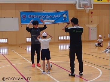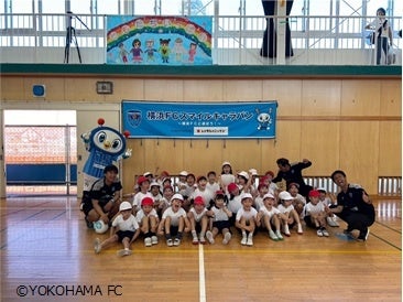 横浜FCホームタウンプロジェクトの1つとして行っているスマイルキャラバンは、サッカーの普及・地域貢献を目的とし、横浜FCサッカースクールコーチやスタッフの方が横浜市内の幼稚園・保育園・小学校を訪問し、子どもたちの運動能力向上・体を動かすことの楽しさを伝え、地域創生活動への寄与を目指し実施しています。当社は、この活動に賛同し、2024年度より協賛・参加しております。