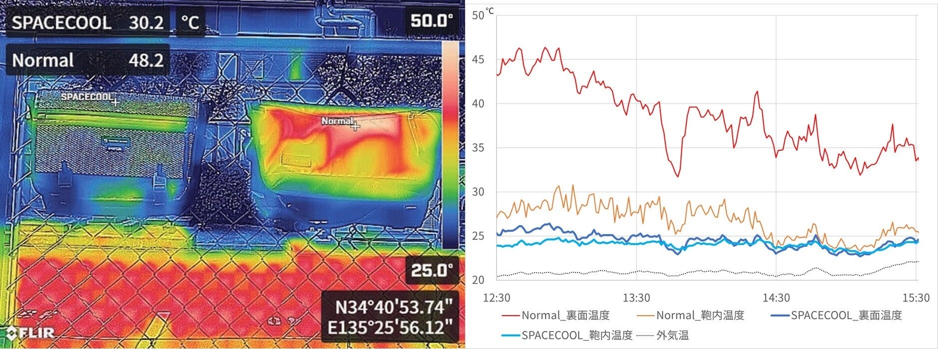SPACECOOLを使用したバッグと不使用のバッグの温度差を外気温が20℃前後の日中に測定したところ、「フラップ部分の裏面温度」は20℃以上、「バッグの内部温度」は6℃以上、SPACECOOLを使用したバッグの方が低いという試験結果を確認できたことから、この度の商品化に至りました。