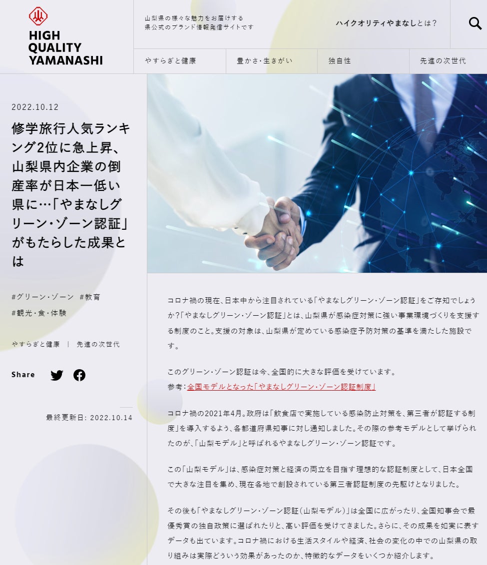 山梨県(知事:長崎幸太郎)は、10月20日、令和4年に運用を開始したブランド情報発信サイト「ハイクオリティやまなし」を大幅リニューアルしました。