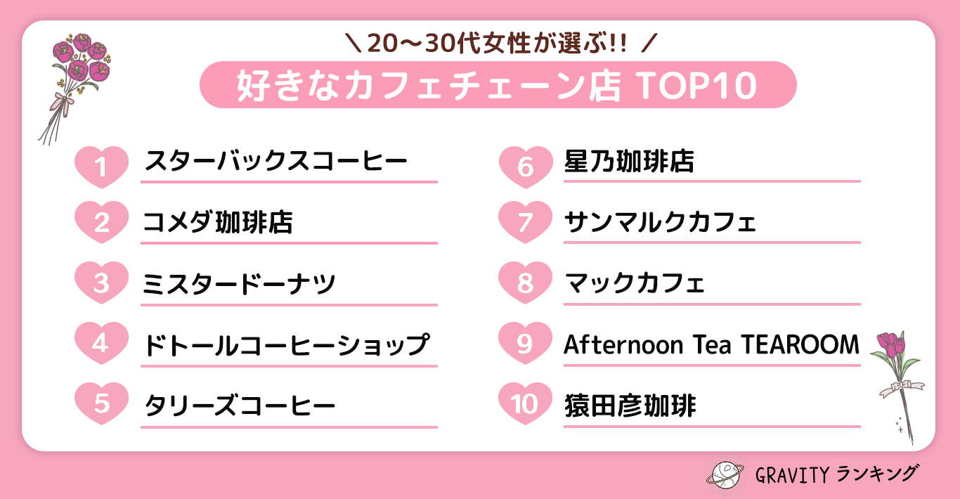 【GRAVITYランキング】20代〜30代女性が選ぶ!!「好きなカフェチェーン店 TOP10」