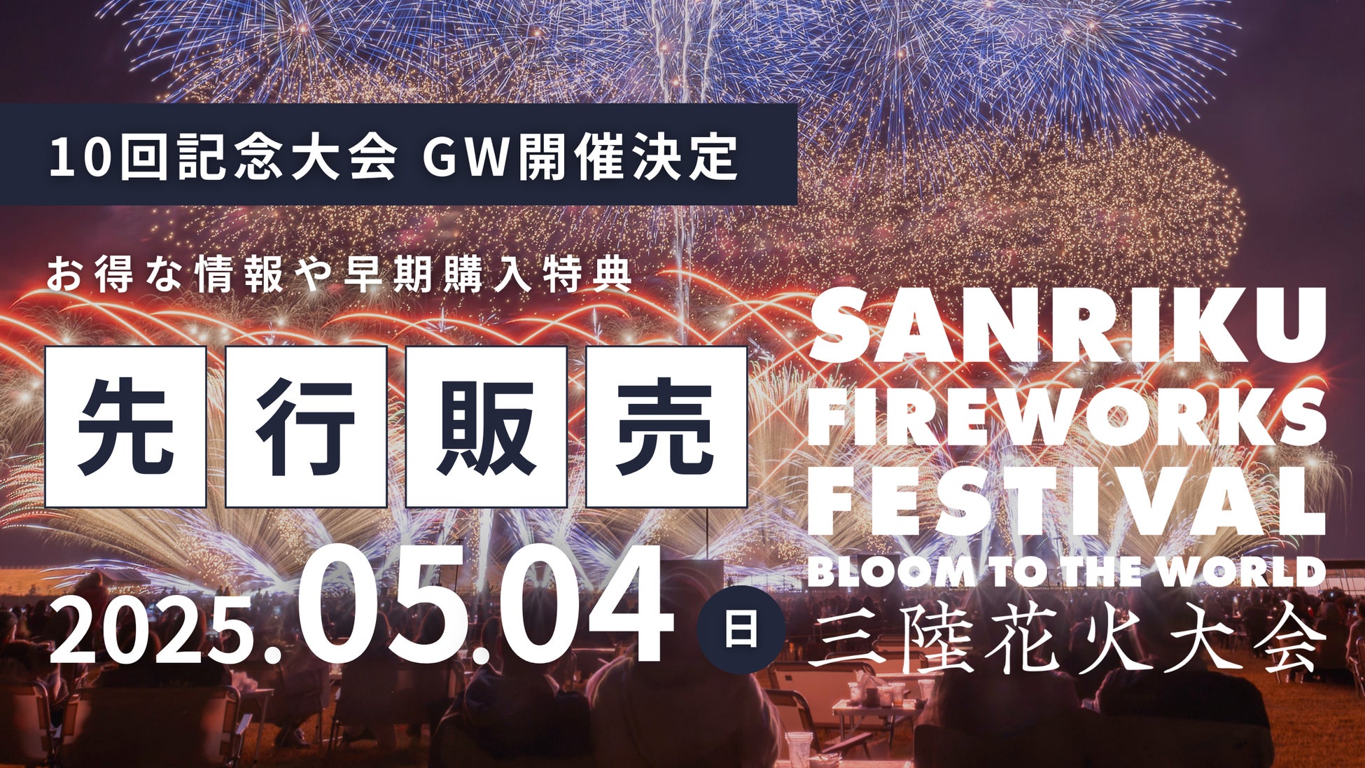 記念すべき「10回目」を迎える三陸花火大会2025 - SANRIKU FIREWORKS FESTIVAL - 国内最高峰のロケーション 「高田松原運動公園」(岩手県陸前高田市)を舞台に、圧巻の花火ショーが繰り広げられます。本大会は、これまで以上の感動をお届けするために特別な演出が満載。三陸花火の歴史と未来を祝う、この記念すべき大会にぜひお越しください!