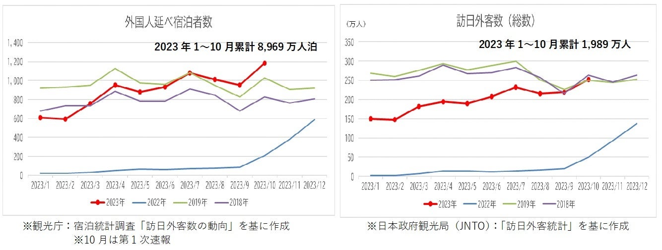 訪日外客数は1~10月累計で1,989万人となり、2023年中に2000万人台に回復。