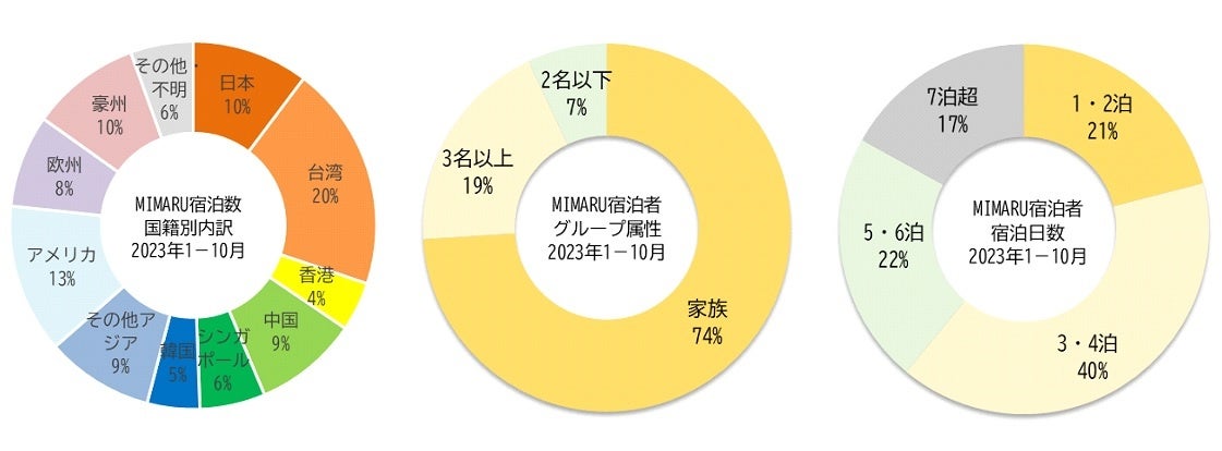 宿泊者属性も概ねコロナ前の状況に戻り、2023年1-10月の宿泊数国籍は、日本1割、その他のアジア5割、その他4割となりました。また、家族7割、グループ2割、その他1割、平均滞在日数は約3.4日と、家族・グループでの中長期滞在という、想定ターゲット通りの利用状況となっています。